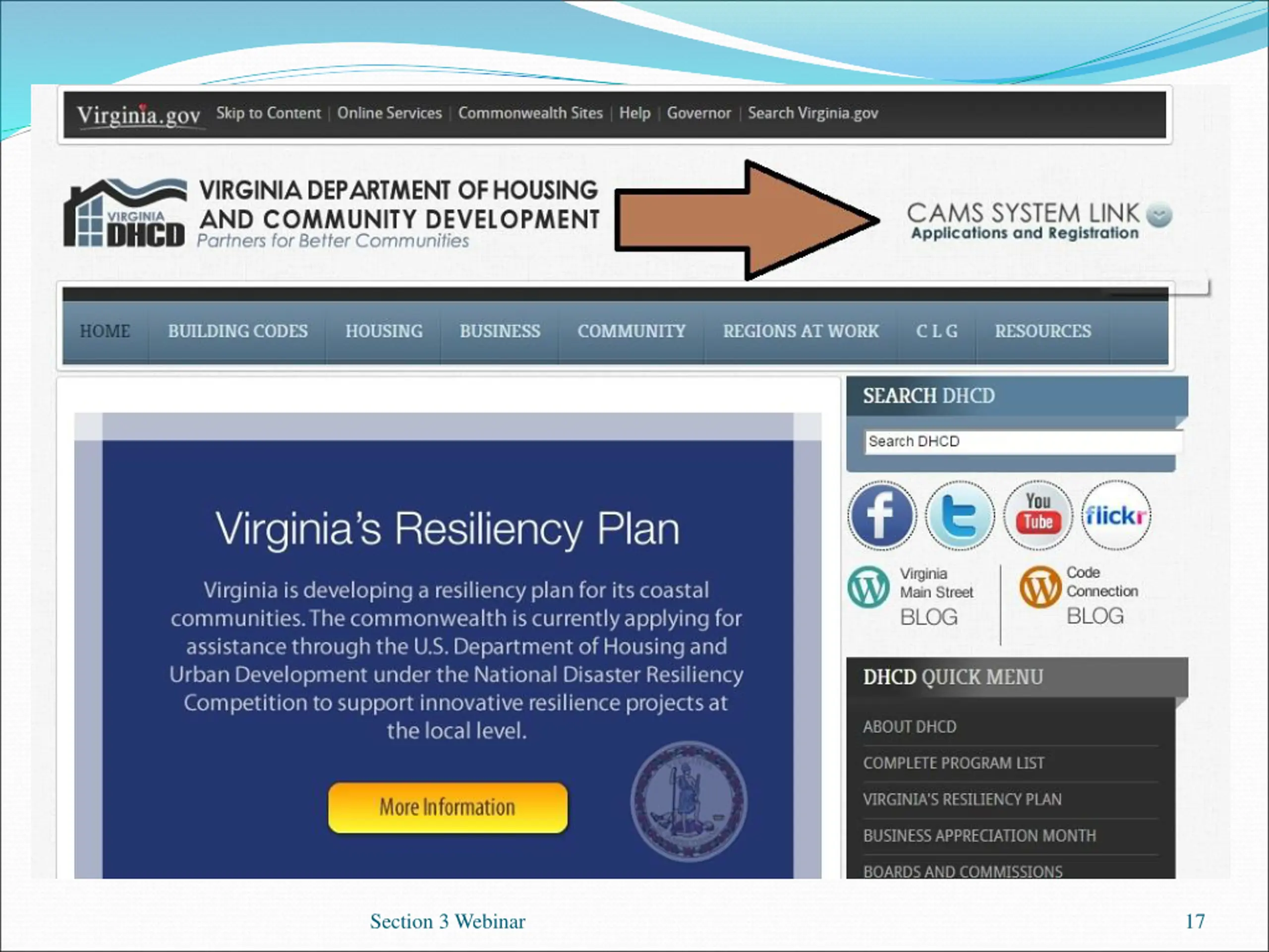 Insert Screen Shots After this Where to find CAMS Location of Section 3 Report (Due March 31, 2016) Section 3 Report Content Section 3 Webinar 17