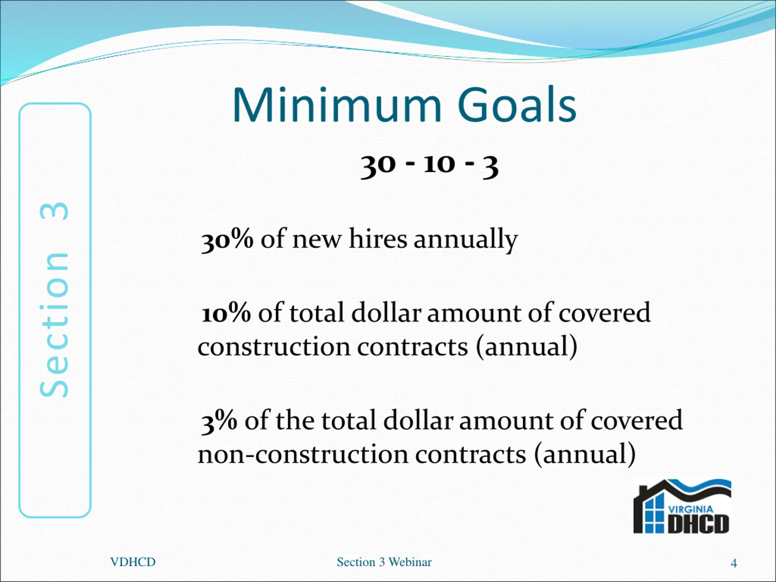 Minimum Goals 30 - 10 - 3 Section 3 30% of new hires annually 10% of total dollar amount of covered construction contracts (annual) 3% of the total dollar amount of covered non-construction contracts (annual) VDHCD Section 3 Webinar 4