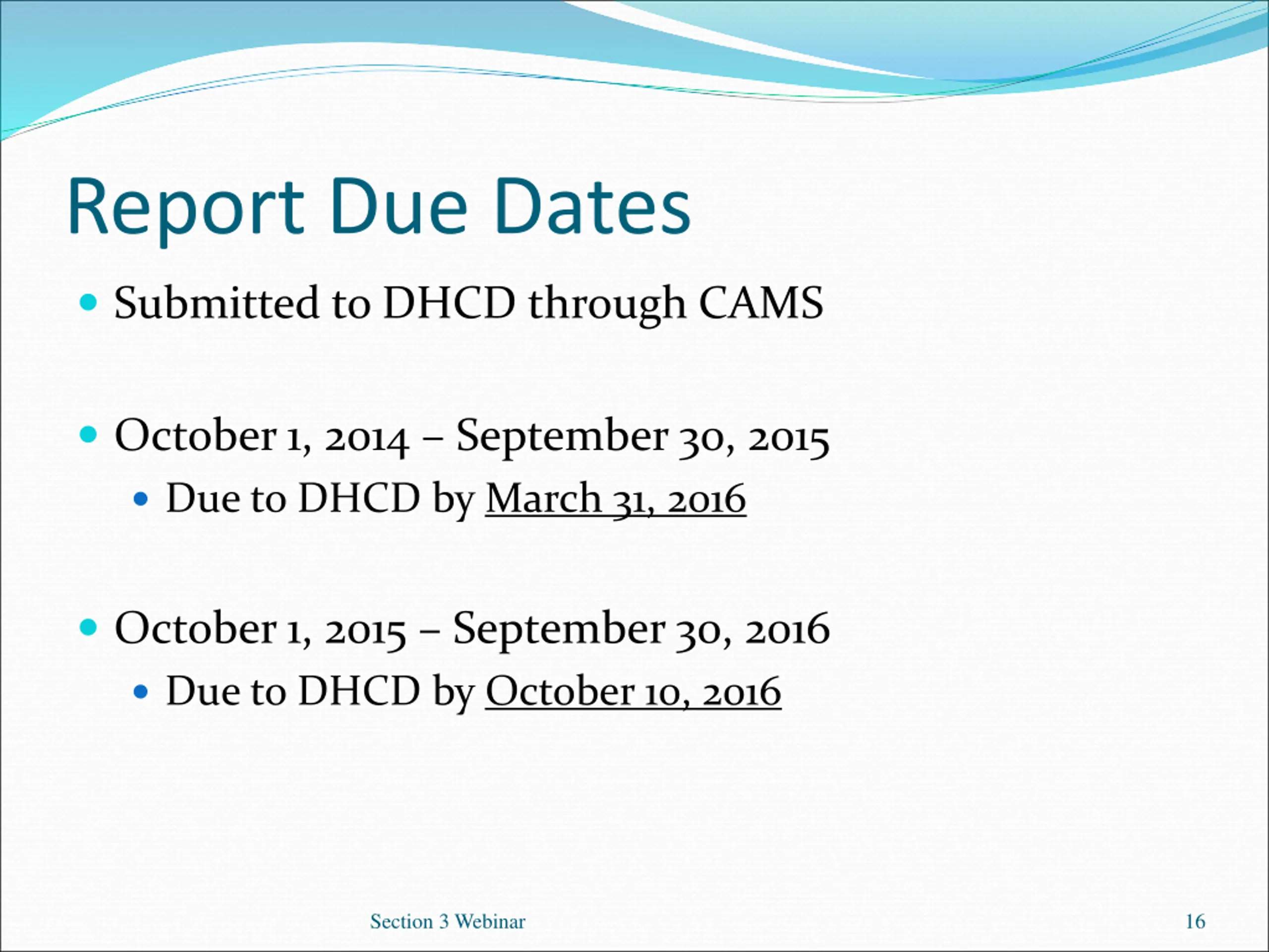 Report Due Dates Submitted to DHCD through CAMS October 1, 2014 September 30, 2015 Due to DHCD by March 31, 2016 October 1, 2015 September 30, 2016 Due to DHCD by October 10, 2016 Section 3 Webinar 16