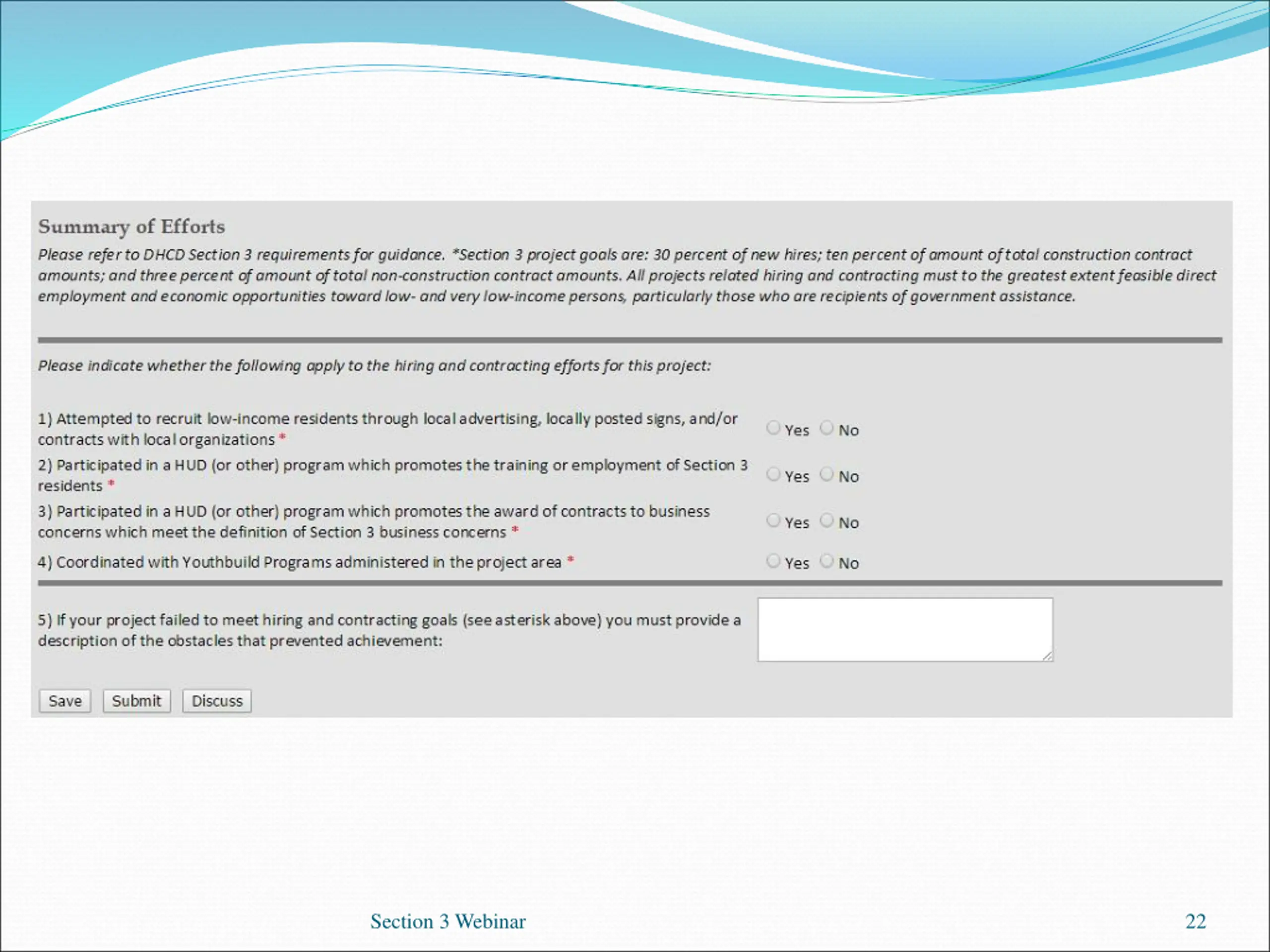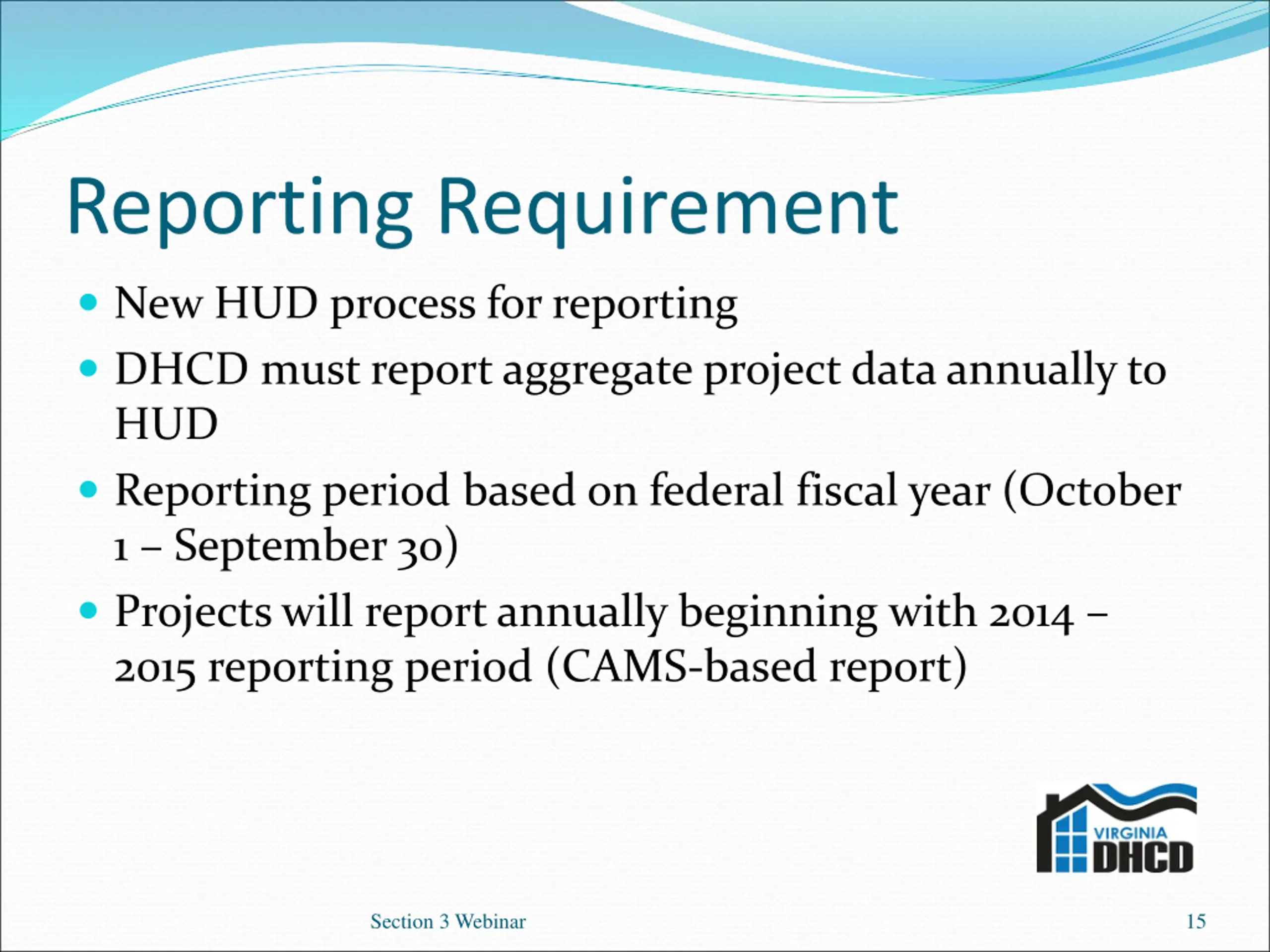 Reporting Requirement New HUD process for reporting DHCD must report aggregate project data annually to HUD Reporting period based on federal fiscal year (October 1 September 30) Projects will report annually beginning with 2014 2015 reporting period (CAMS-based report) Section 3 Webinar 15