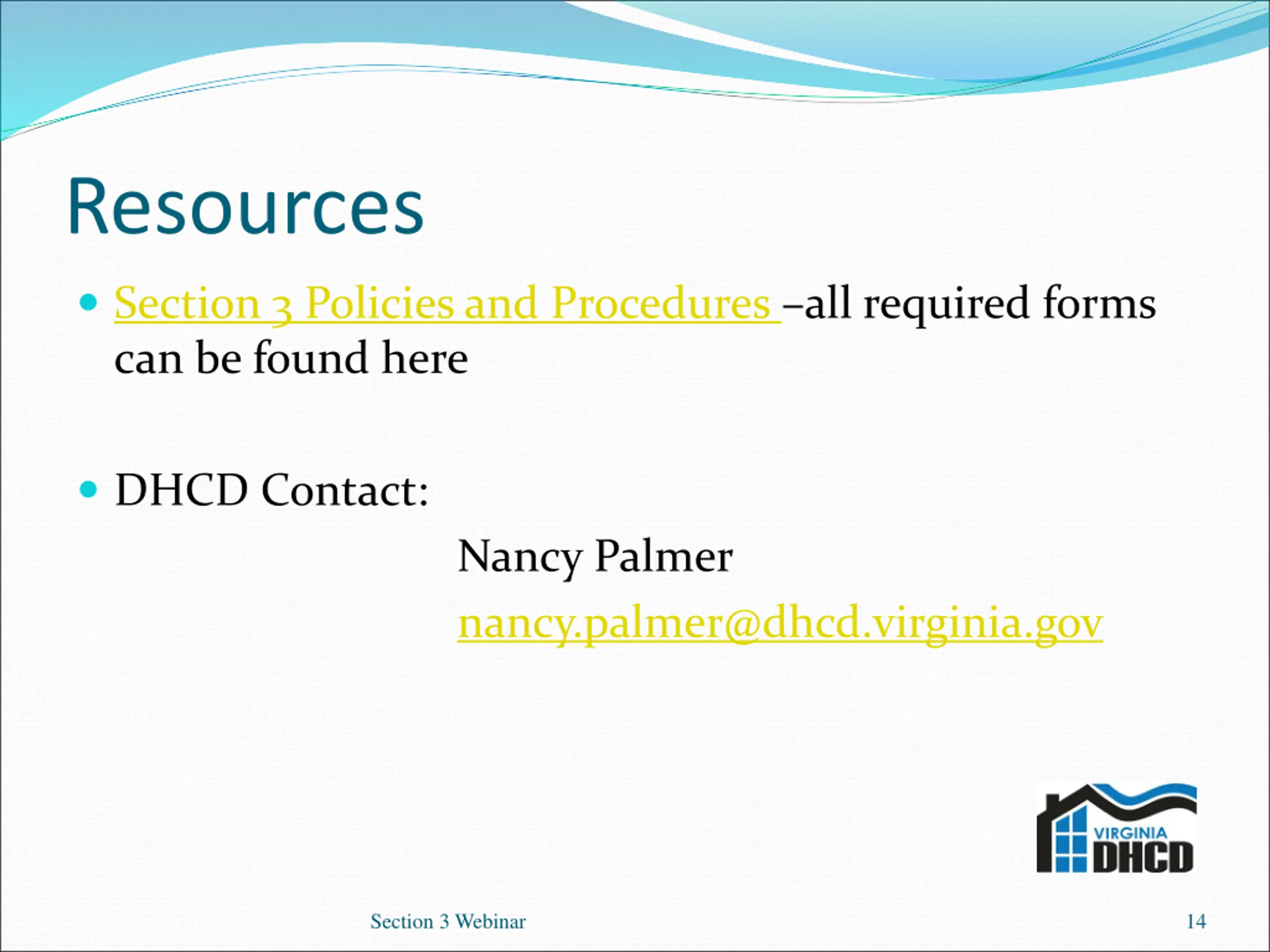 Resources Section 3 Policies and Procedures all required forms can be found here DHCD Contact: Nancy Palmer nancy.palmer@dhcd.virginia.gov Section 3 Webinar 14
