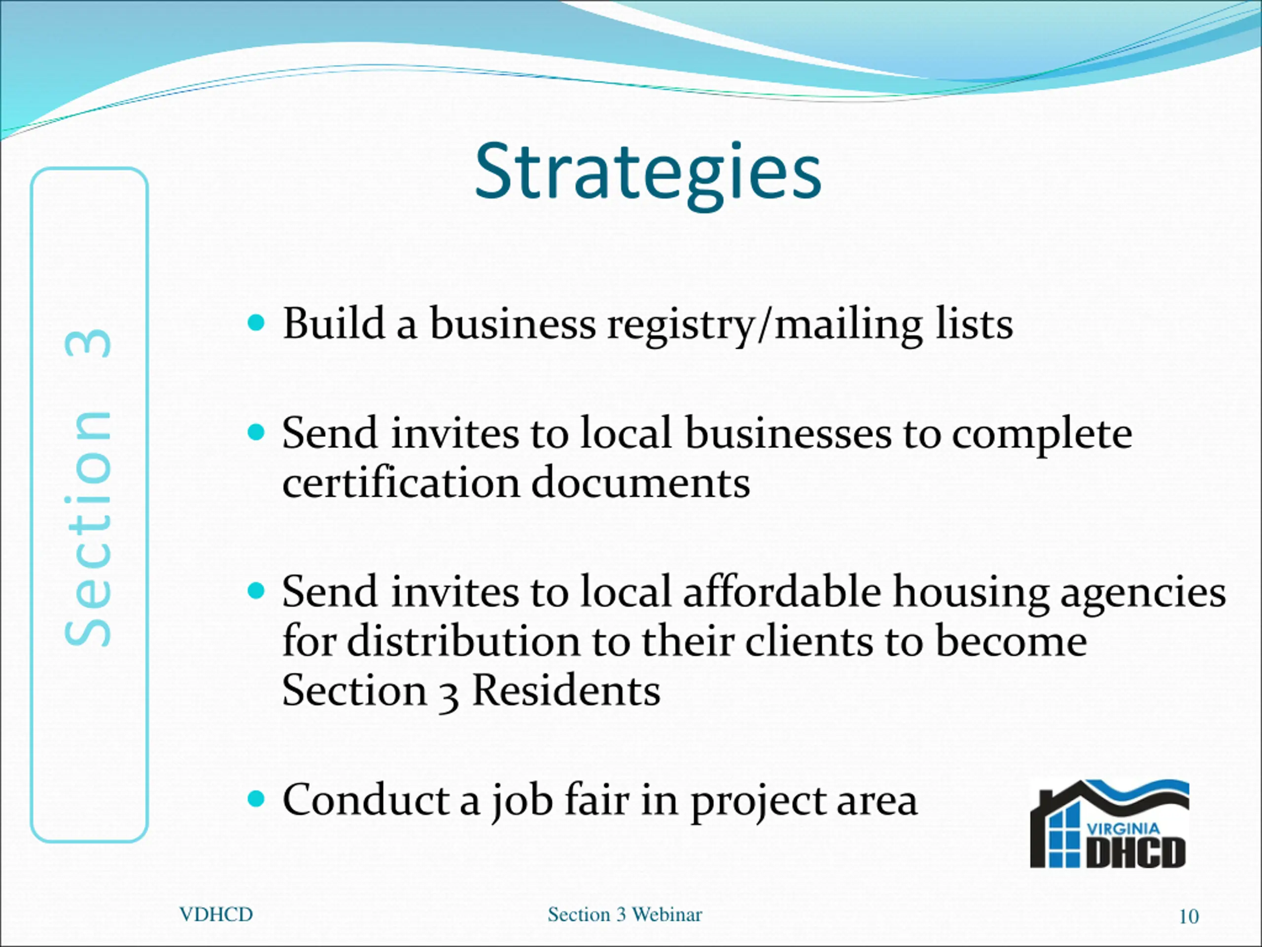 Strategies Build a business registry/mailing lists Section 3 Send invites to local businesses to complete certification documents Send invites to local affordable housing agencies for distribution to their clients to become Section 3 Residents Conduct a job fair in project area VDHCD Section 3 Webinar 10