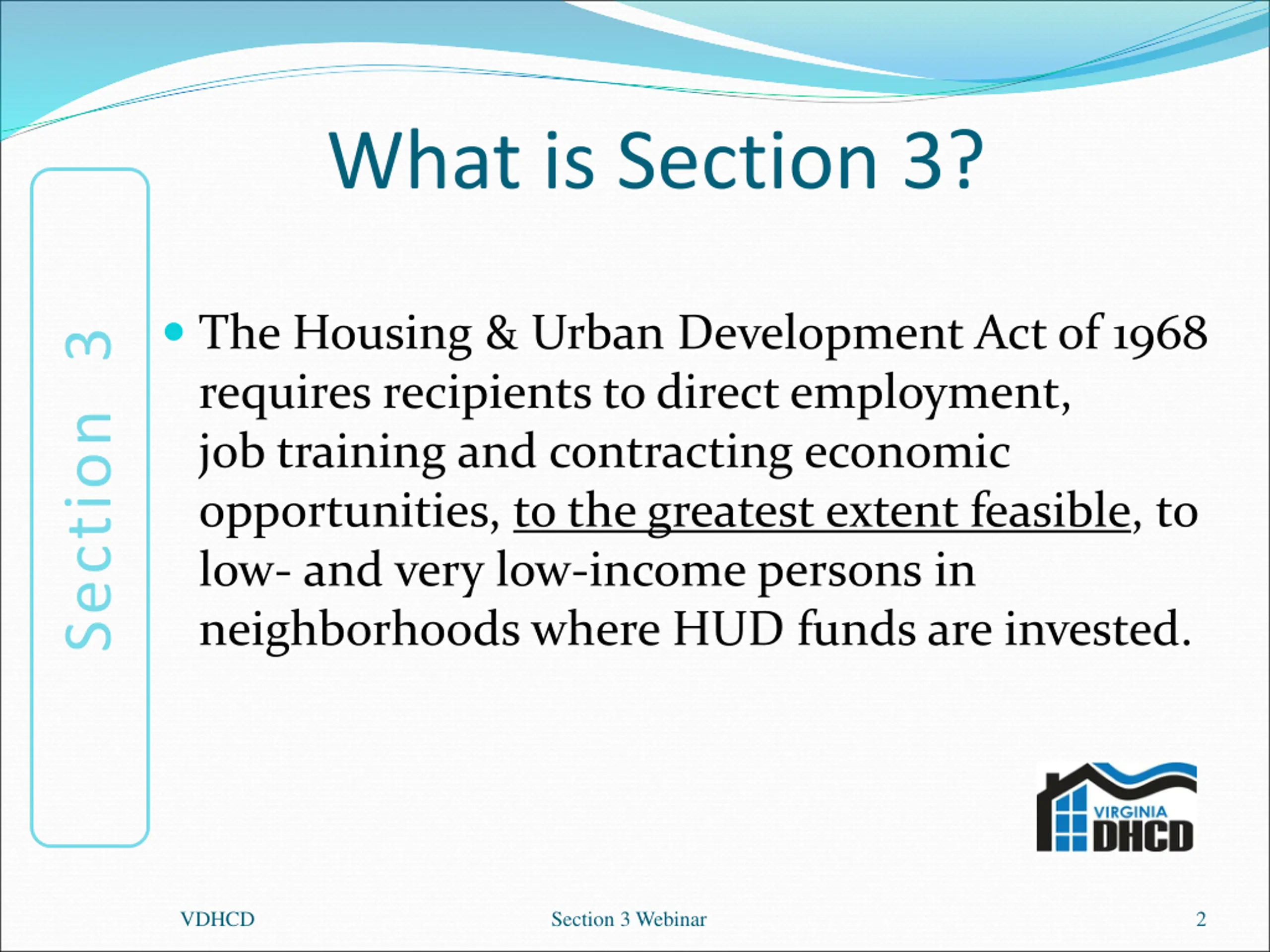 What is Section 3? The Housing & Urban Development Act of 1968 requires recipients to direct employment, job training and contracting economic opportunities, to the greatest extent feasible, to low- and very low-income persons in neighborhoods where HUD funds are invested. Section 3 VDHCD Section 3 Webinar 2