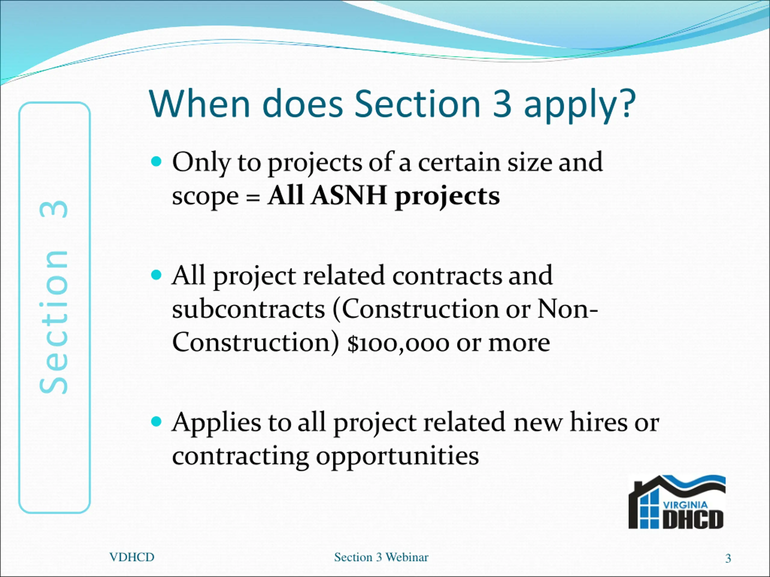When does Section 3 apply? Only to projects of a certain size and scope = All ASNH projects Section 3 All project related contracts and subcontracts (Construction or Non- Construction) $100,000 or more Applies to all project related new hires or contracting opportunities VDHCD Section 3 Webinar 3