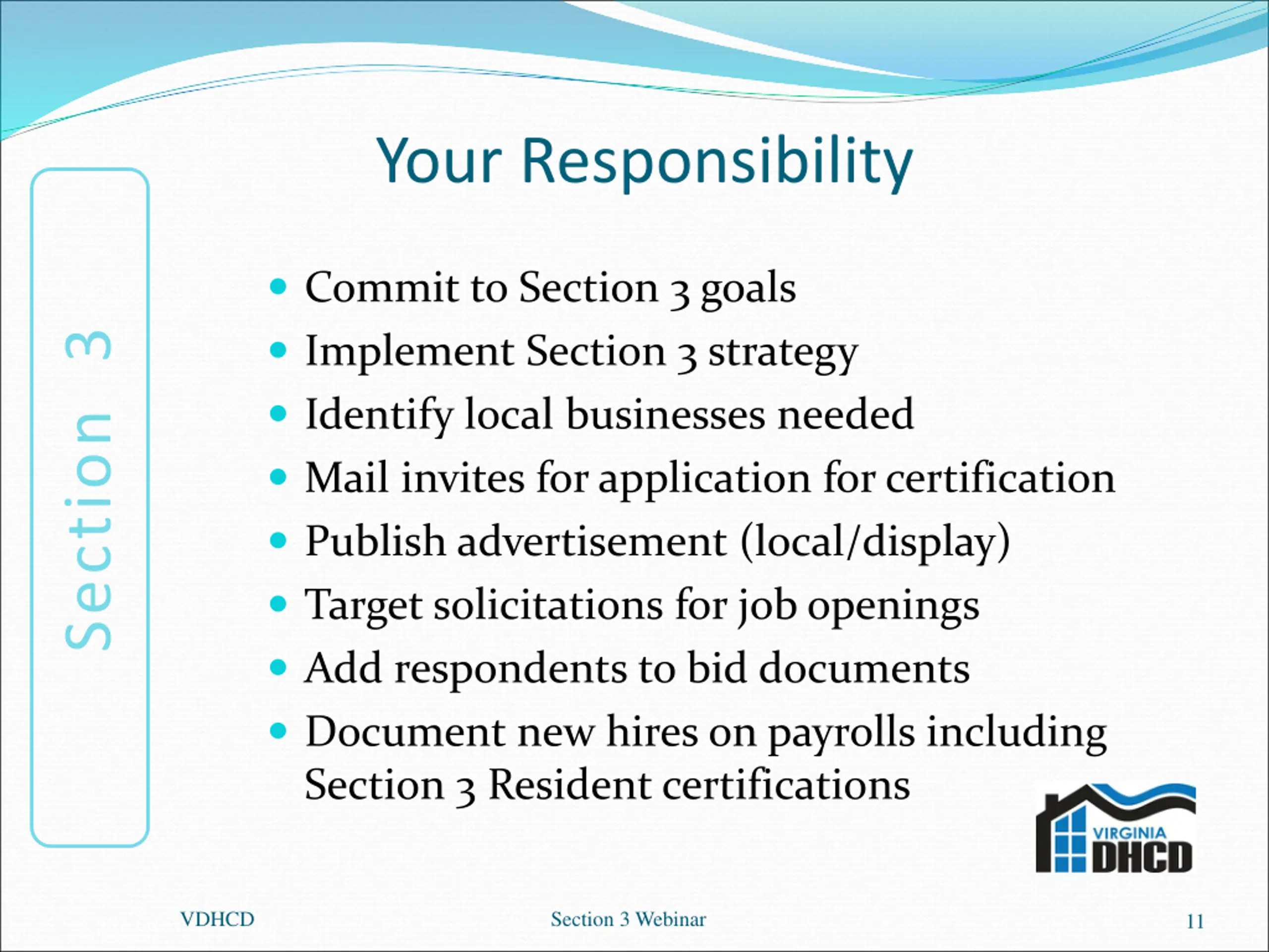 Your Responsibility Commit to Section 3 goals Implement Section 3 strategy Identify local businesses needed Mail invites for application for certification Publish advertisement (local/display) Target solicitations for job openings Add respondents to bid documents Document new hires on payrolls including Section 3 Resident certifications Section 3 VDHCD Section 3 Webinar 11