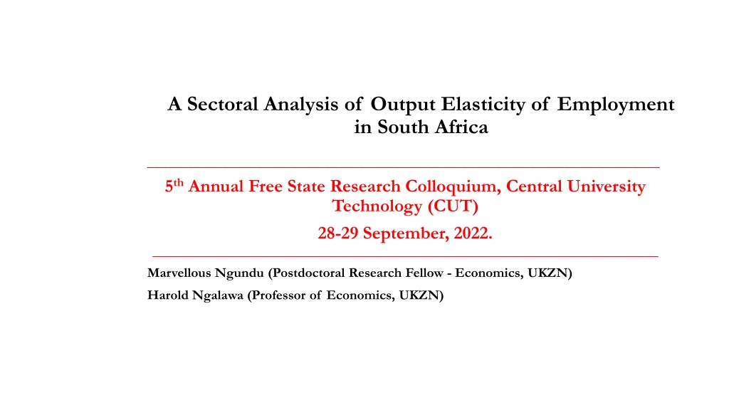 A Sectoral Analysis of Output Elasticity of Employment in South Africa ___________________________________________________________________________ 5thAnnual Free State Research Colloquium, Central University Technology (CUT) 28-29 September, 2022. __________________________________________________________________________ Marvellous Ngundu (Postdoctoral Research Fellow - Economics, UKZN) Harold Ngalawa (Professor of Economics, UKZN)