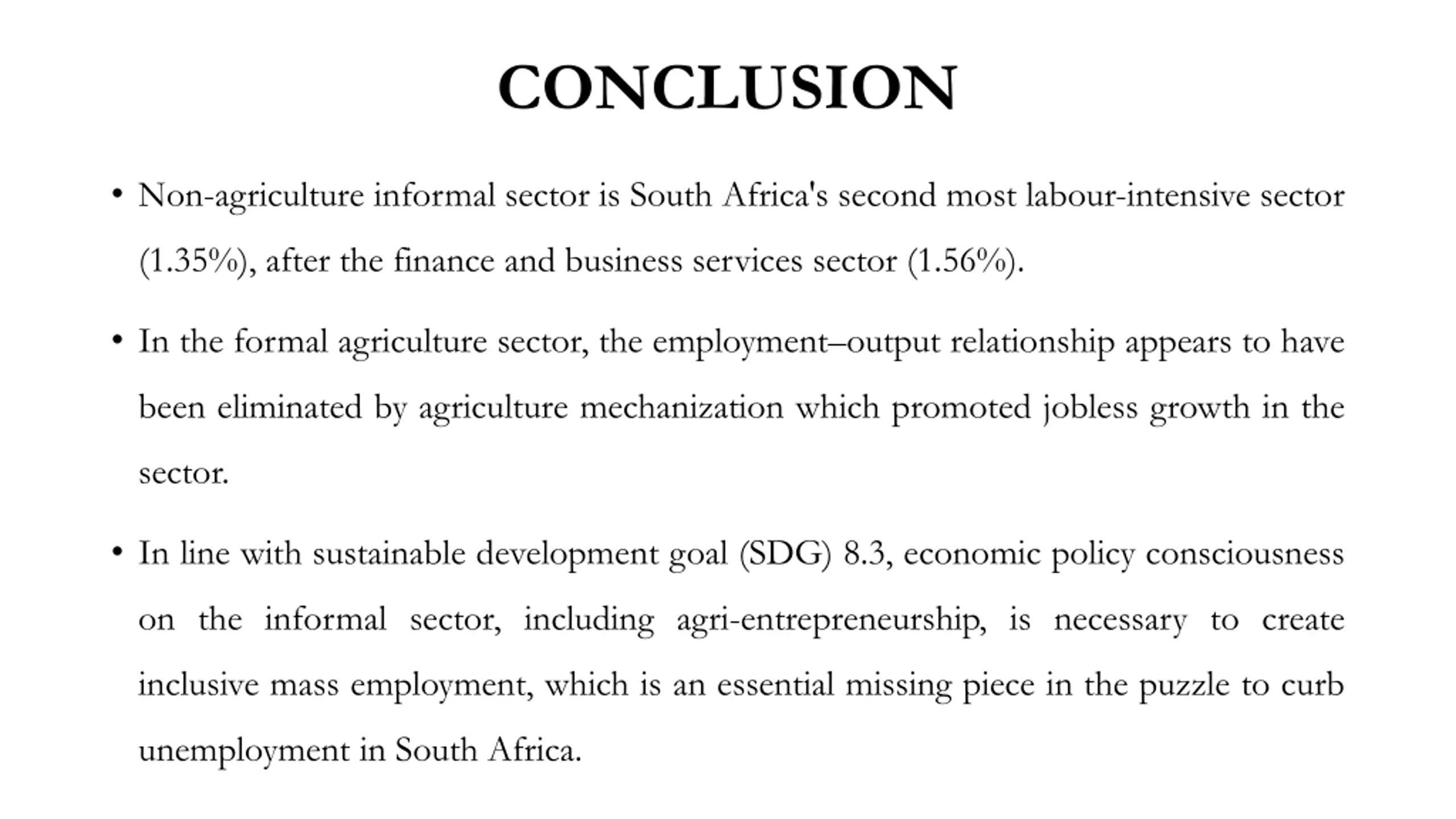 CONCLUSION Non-agriculture informal sector is South Africa's second most labour-intensive sector (1.35%), after the finance and business services sector (1.56%). In the formal agriculture sector, the employment output relationship appears to have been eliminated by agriculture mechanization which promoted jobless growth in the sector. In line with sustainable development goal (SDG) 8.3, economic policy consciousness on the informal sector, including agri-entrepreneurship, is necessary to create inclusive mass employment, which is an essential missing piece in the puzzle to curb unemployment in South Africa.