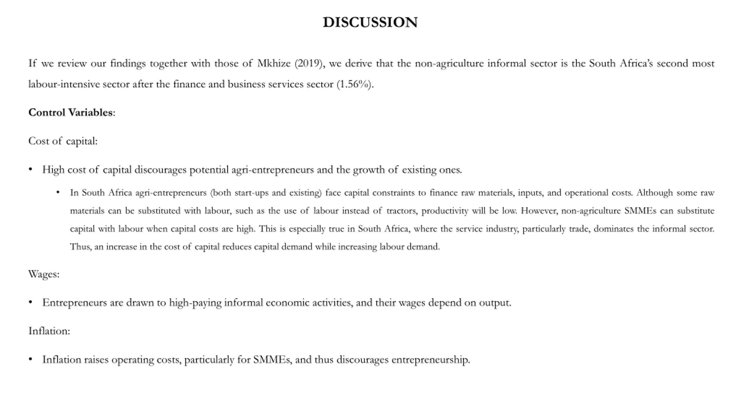 DISCUSSION If we review our findings together with those of Mkhize (2019), we derive that the non-agriculture informal sector is the South Africa s second most labour-intensive sector after the finance and business services sector (1.56%). Control Variables: Cost of capital: High cost of capital discourages potential agri-entrepreneurs and the growth of existing ones. In South Africa agri-entrepreneurs (both start-ups and existing) face capital constraints to finance raw materials, inputs, and operational costs. Although some raw materials can be substituted with labour, such as the use of labour instead of tractors, productivity will be low. However,non-agriculture SMMEs can substitute capital with labour when capital costs are high. This is especially true in South Africa, where the service industry, particularly trade, dominates the informal sector. Thus, an increase in the cost of capital reduces capital demand while increasing labour demand. Wages: Entrepreneurs are drawn to high-paying informal economic activities, and their wages depend on output. Inflation: Inflation raises operating costs, particularly for SMMEs, and thus discourages entrepreneurship.