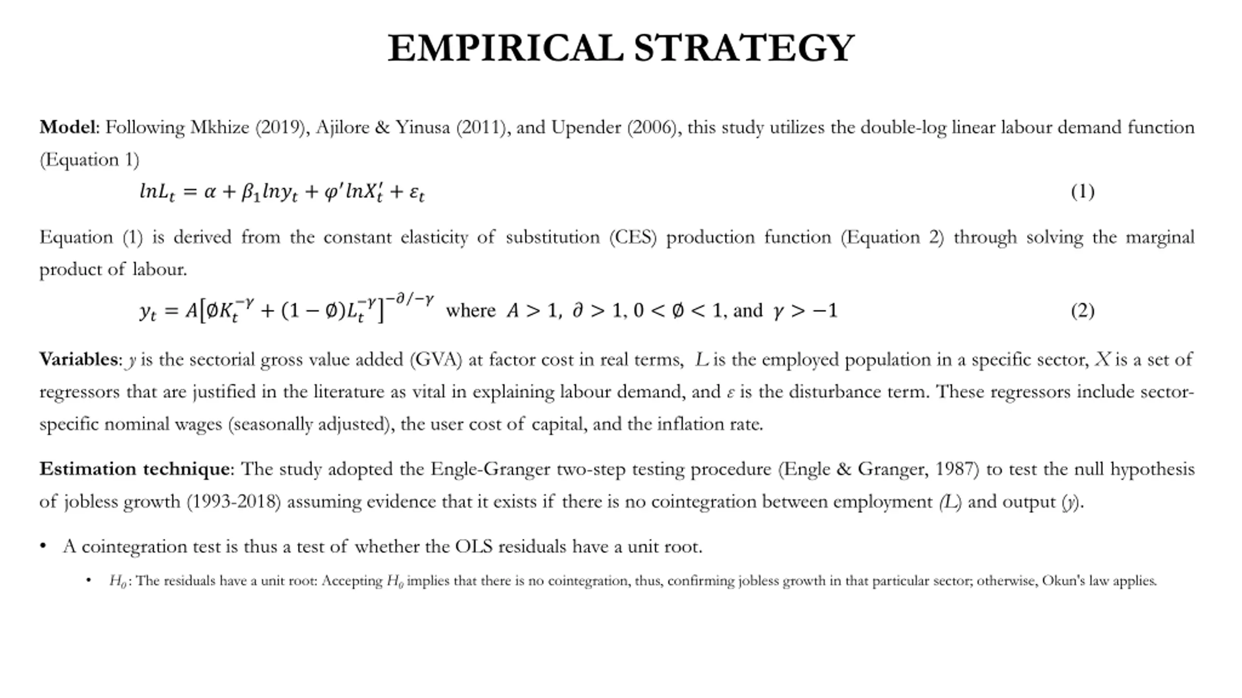 EMPIRICAL STRATEGY Model: Following Mkhize (2019), Ajilore & Yinusa (2011), and Upender (2006), this study utilizes the double-log linear labour demand function (Equation 1) ????= ? + ?1????+ ? ???? + ?? (1) Equation (1) is derived from the constant elasticity of substitution (CES) production function (Equation 2) through solving the marginal product of labour. ? ?where ? > 1, ? > 1, 0 < < 1, and ? > 1 ?+ 1 ?? ? (2) ??= ? ?? Variables: y is the sectorial gross value added (GVA) at factor cost in real terms, L is the employed population in a specific sector, X is a set of regressors that are justified in the literature as vital in explaining labour demand, and is the disturbance term. These regressors include sector- specific nominal wages (seasonally adjusted), the user cost of capital, and the inflation rate. Estimation technique: The study adopted the Engle-Granger two-step testing procedure (Engle & Granger, 1987) to test the null hypothesis of jobless growth (1993-2018) assuming evidence that it exists if there is no cointegration between employment (L) and output (y). A cointegration test is thus a test of whether the OLS residuals have a unit root. H0: The residuals have a unit root: Accepting H0implies that there is no cointegration, thus, confirming jobless growth in that particular sector; otherwise, Okun's law applies.