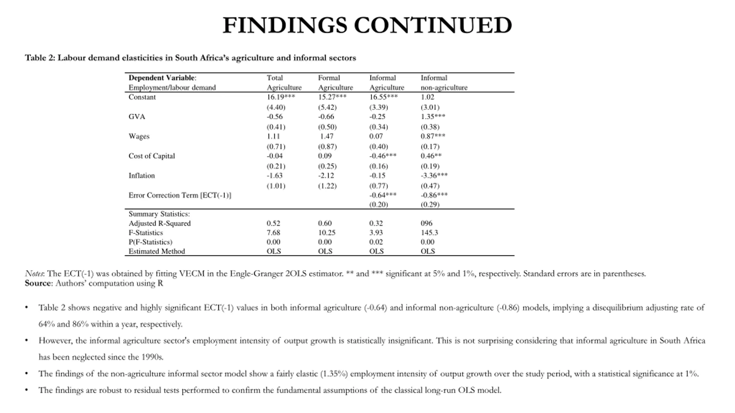 FINDINGS CONTINUED Table 2: Labour demand elasticities in South Africa s agriculture and informal sectors Dependent Variable: Employment/labour demand Constant Total Agriculture 16.19*** (4.40) -0.56 (0.41) 1.11 (0.71) -0.04 (0.21) -1.63 (1.01) Formal Agriculture 15.27*** (5.42) -0.66 (0.50) 1.47 (0.87) 0.09 (0.25) -2.12 (1.22) Informal Agriculture 16.55*** (3.39) -0.25 (0.34) 0.07 (0.40) -0.46*** (0.16) -0.15 (0.77) -0.64*** (0.20) Informal non-agriculture 1.02 (3.01) 1.35*** (0.38) 0.87*** (0.17) 0.46** (0.19) -3.36*** (0.47) -0.86*** (0.29) GVA Wages Cost of Capital Inflation Error Correction Term [ECT(-1)] Summary Statistics: Adjusted R-Squared F-Statistics P(F-Statistics) Estimated Method 0.52 7.68 0.00 OLS 0.60 10.25 0.00 OLS 0.32 3.93 0.02 OLS 096 145.3 0.00 OLS Notes: The ECT(-1) was obtained by fitting VECM in the Engle-Granger 2OLS estimator. ** and *** significant at 5% and 1%, respectively. Standard errors are in parentheses. Source: Authors computation using R Table 2 shows negative and highly significant ECT(-1) values in both informal agriculture (-0.64) and informal non-agriculture (-0.86) models, implying a disequilibrium adjusting rate of 64% and 86% within a year, respectively. However, the informal agriculture sector's employment intensity of output growth is statistically insignificant. This is not surprising considering that informal agriculture in South Africa has been neglected since the 1990s. The findings of the non-agriculture informal sector model show a fairly elastic (1.35%) employment intensity of output growth over the study period, with a statistical significance at 1%. The findings are robust to residual tests performed to confirm the fundamental assumptions of the classical long-run OLS model.