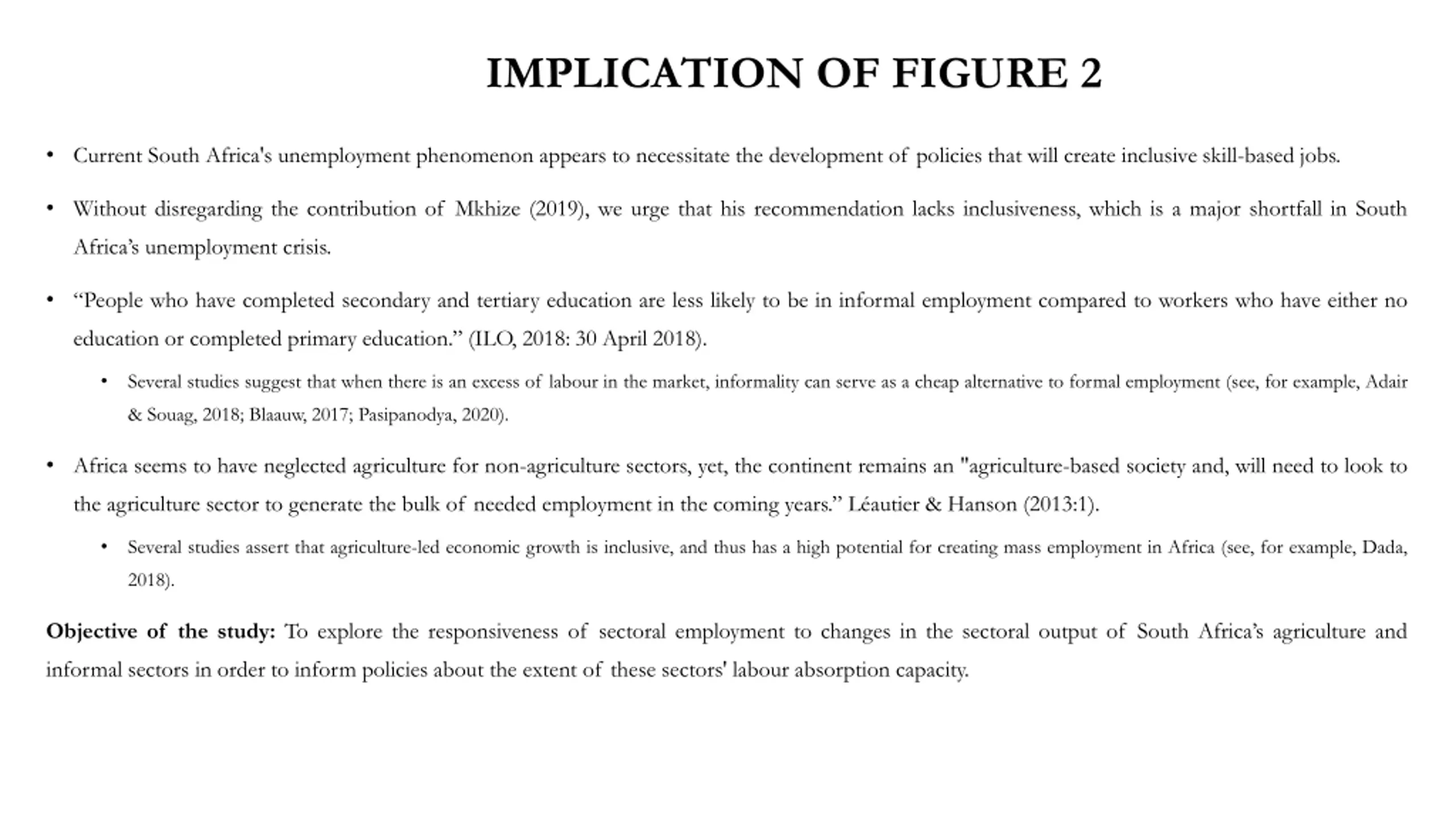 IMPLICATION OF FIGURE 2 Current South Africa's unemployment phenomenon appears to necessitate the development of policies that will create inclusive skill-based jobs. Without disregarding the contribution of Mkhize (2019), we urge that his recommendation lacks inclusiveness, which is a major shortfall in South Africa s unemployment crisis. People who have completed secondary and tertiary education are less likely to be in informal employment compared to workers who have either no education or completed primary education. (ILO, 2018: 30 April 2018). Several studies suggest that when there is an excess of labour in the market, informality can serve as a cheap alternative to formal employment (see, for example, Adair & Souag, 2018; Blaauw, 2017; Pasipanodya, 2020). Africa seems to have neglected agriculture for non-agriculture sectors, yet, the continent remains an "agriculture-based society and, will need to look to the agriculture sector to generate the bulk of needed employment in the coming years. L autier & Hanson (2013:1). Several studies assert that agriculture-led economic growth is inclusive, and thus has a high potential for creating mass employment in Africa (see, for example, Dada, 2018). Objective of the study: To explore the responsiveness of sectoral employment to changes in the sectoral output of South Africa s agriculture and informal sectors in order to inform policies about the extent of these sectors' labour absorption capacity.