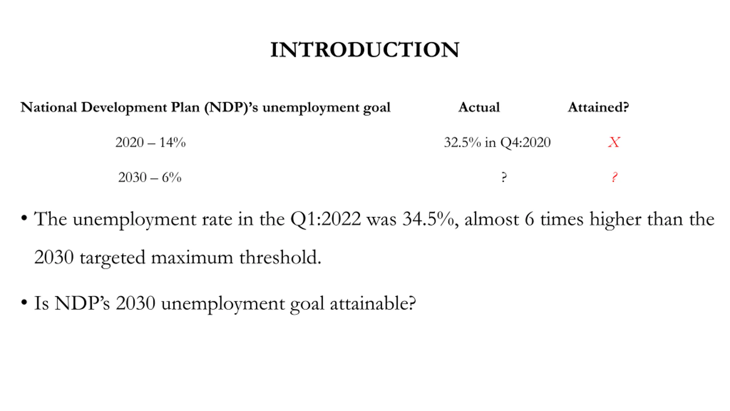 INTRODUCTION National Development Plan (NDP) s unemployment goal Actual Attained? 2020 14% 32.5% in Q4:2020 X 2030 6% ? ? The unemployment rate in the Q1:2022 was 34.5%, almost 6 times higher than the 2030 targeted maximum threshold. Is NDP s 2030 unemployment goal attainable?