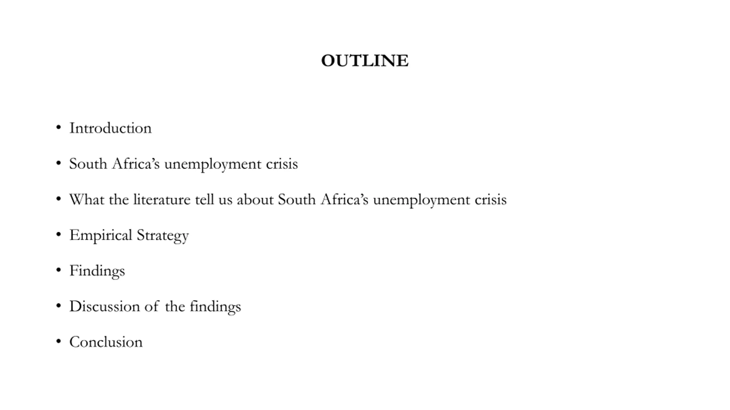 OUTLINE Introduction South Africa s unemployment crisis What the literature tell us about South Africa s unemployment crisis Empirical Strategy Findings Discussion of the findings Conclusion