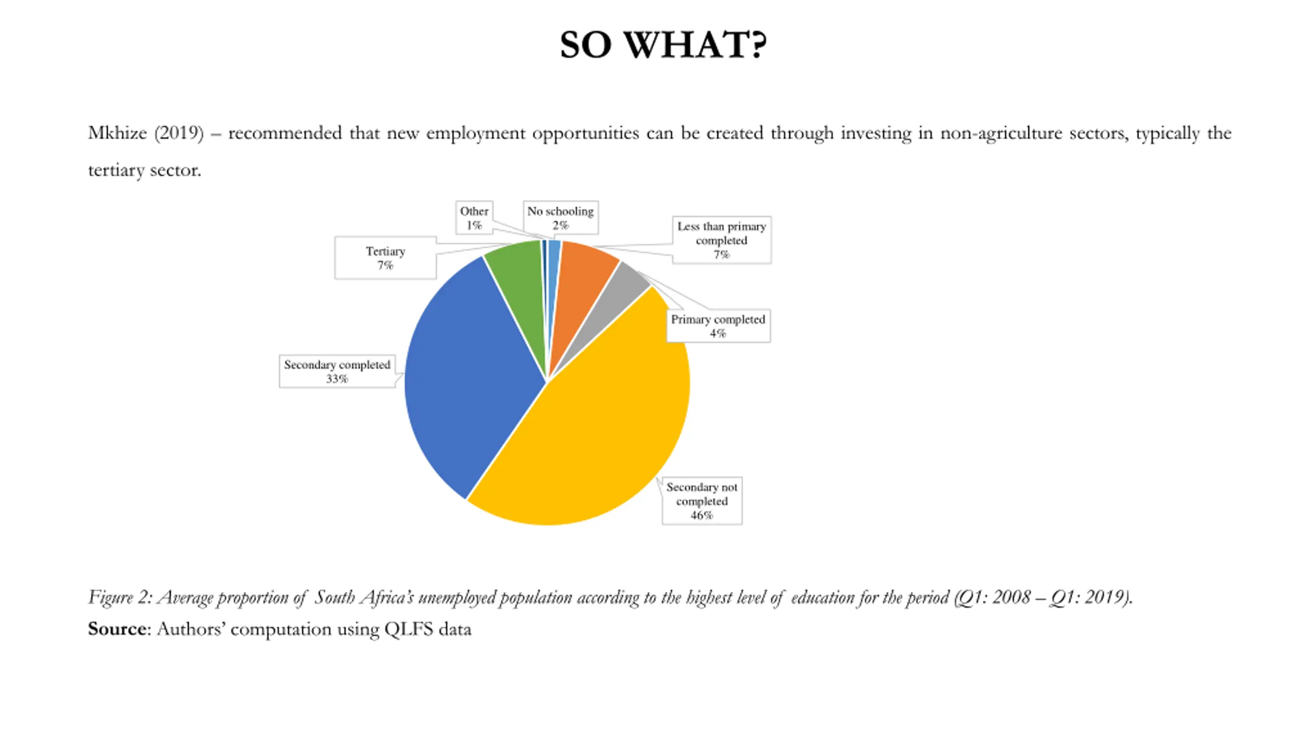 SO WHAT? Mkhize (2019) recommended that new employment opportunities can be created through investing in non-agriculture sectors, typically the tertiary sector. Other 1% No schooling 2% Less than primary completed 7% Tertiary 7% Primary completed 4% Secondary completed 33% Secondary not completed 46% Figure 2: Average proportion of South Africa s unemployed population according to the highest level of education for the period (Q1: 2008 Q1: 2019). Source: Authors computation using QLFS data