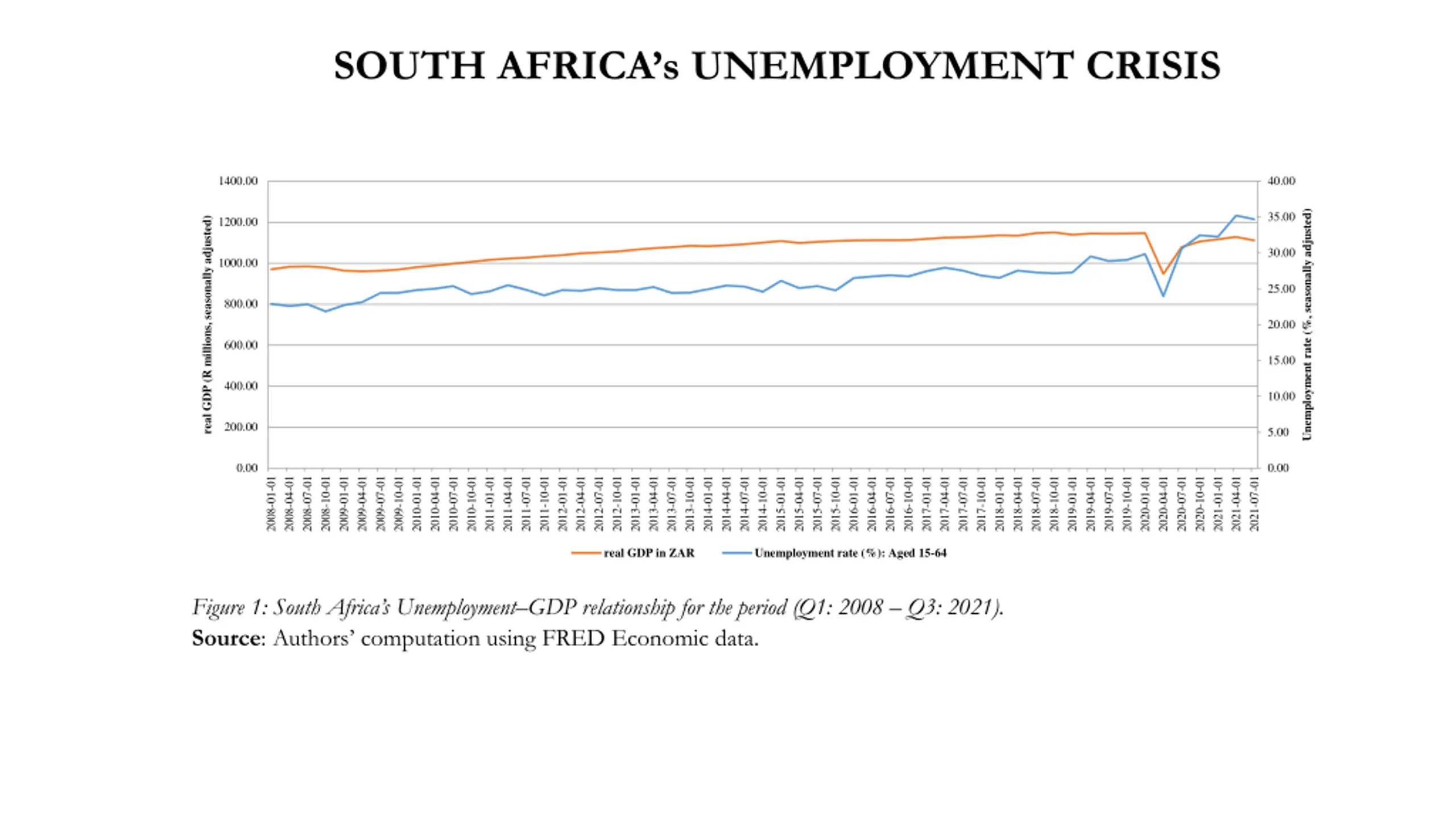 SOUTH AFRICAs UNEMPLOYMENT CRISIS 1400.00 40.00 Unemployment rate (%, seasonally adjusted) 35.00 1200.00 real GDP (R millions, seasonally adjusted) 30.00 1000.00 25.00 800.00 20.00 600.00 15.00 400.00 10.00 200.00 5.00 0.00 0.00 2008-01-01 2008-04-01 2008-07-01 2008-10-01 2009-01-01 2009-04-01 2009-07-01 2009-10-01 2010-01-01 2010-04-01 2010-07-01 2010-10-01 2011-01-01 2011-04-01 2011-07-01 2011-10-01 2012-01-01 2012-04-01 2012-07-01 2012-10-01 2013-01-01 2013-04-01 2013-07-01 2013-10-01 2014-01-01 2014-04-01 2014-07-01 2014-10-01 2015-01-01 2015-04-01 2015-07-01 2015-10-01 2016-01-01 2016-04-01 2016-07-01 2016-10-01 2017-01-01 2017-04-01 2017-07-01 2017-10-01 2018-01-01 2018-04-01 2018-07-01 2018-10-01 2019-01-01 2019-04-01 2019-07-01 2019-10-01 2020-01-01 2020-04-01 2020-07-01 2020-10-01 2021-01-01 2021-04-01 2021-07-01 real GDP in ZAR Unemployment rate (%): Aged 15-64 Figure 1: South Africa s Unemployment GDP relationship for the period (Q1: 2008 Q3: 2021). Source: Authors computation using FRED Economic data.