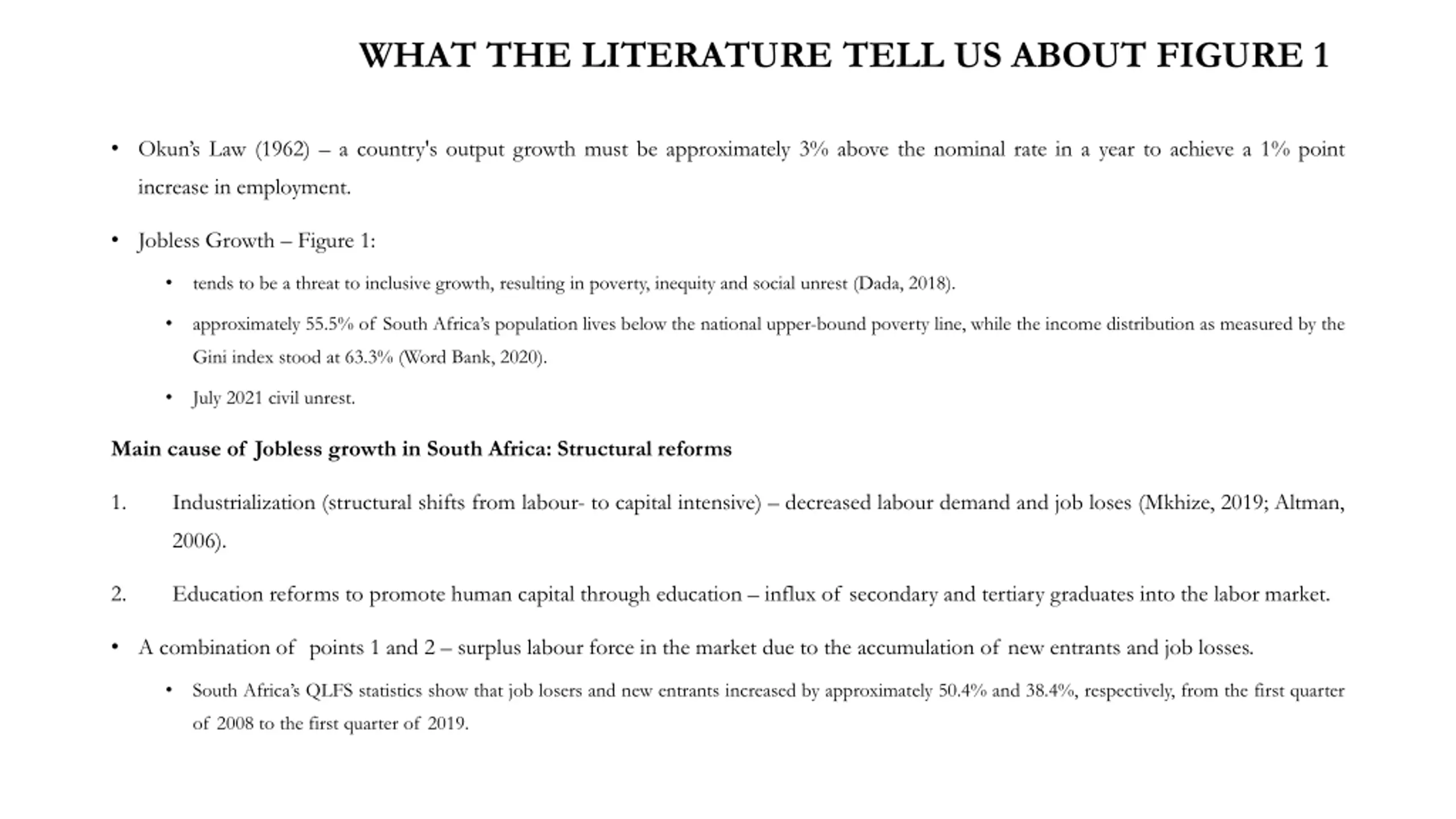 WHAT THE LITERATURE TELL US ABOUT FIGURE 1 Okun s Law (1962) a country's output growth must be approximately 3% above the nominal rate in a year to achieve a 1% point increase in employment. Jobless Growth Figure 1: tends to be a threat to inclusive growth, resulting in poverty, inequity and social unrest (Dada, 2018). approximately 55.5% of South Africa s population lives below the national upper-bound poverty line, while the income distribution as measured by the Gini index stood at 63.3% (Word Bank, 2020). July 2021 civil unrest. Main cause of Jobless growth in South Africa: Structural reforms 1. Industrialization (structural shifts from labour- to capital intensive) decreased labour demand and job loses (Mkhize, 2019; Altman, 2006). 2. Education reforms to promote human capital through education influx of secondary and tertiary graduates into the labor market. A combination of points 1 and 2 surplus labour force in the market due to the accumulation of new entrants and job losses. South Africa s QLFS statistics show that job losers and new entrants increased by approximately 50.4% and 38.4%, respectively, from the first quarter of 2008 to the first quarter of 2019.