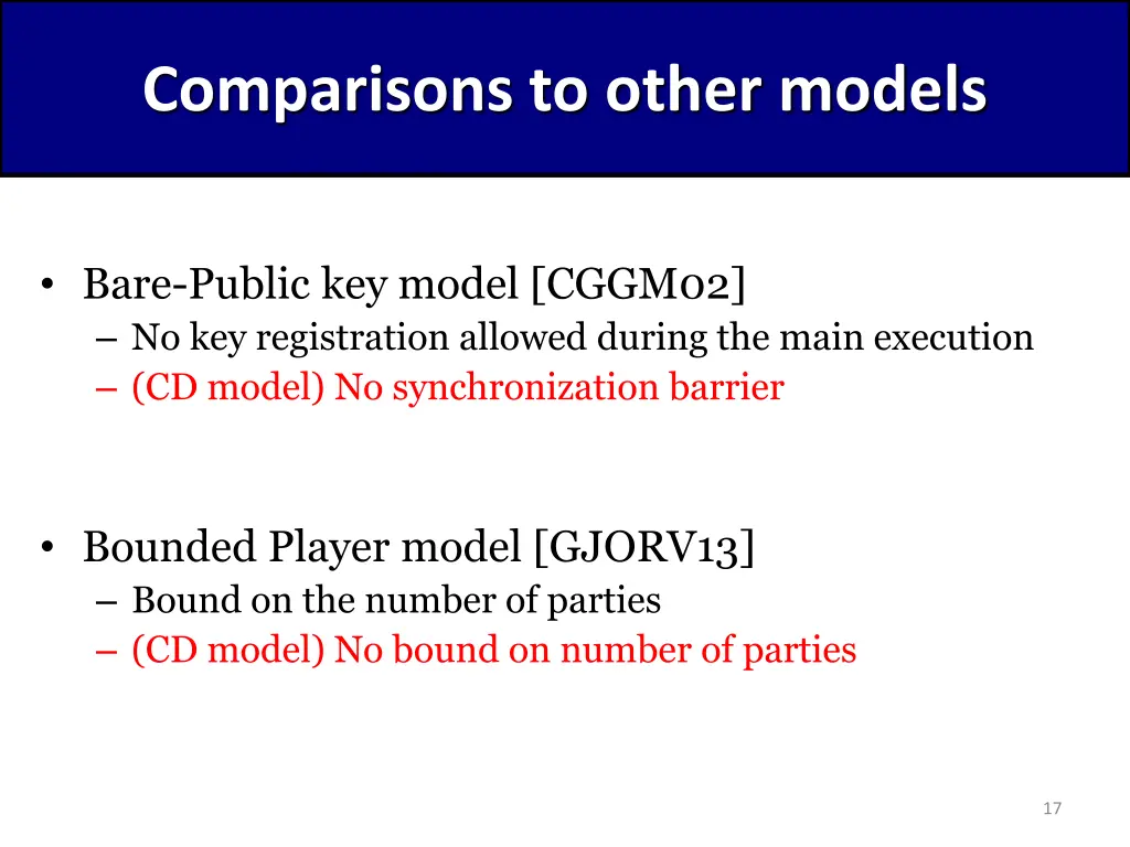Comparisons to other models Bare-Public key model [CGGM02] No key registration allowed during the main execution (CD model) No synchronization barrier Bounded Player model [GJORV13] Bound on the number of parties (CD model) No bound on number of parties 17