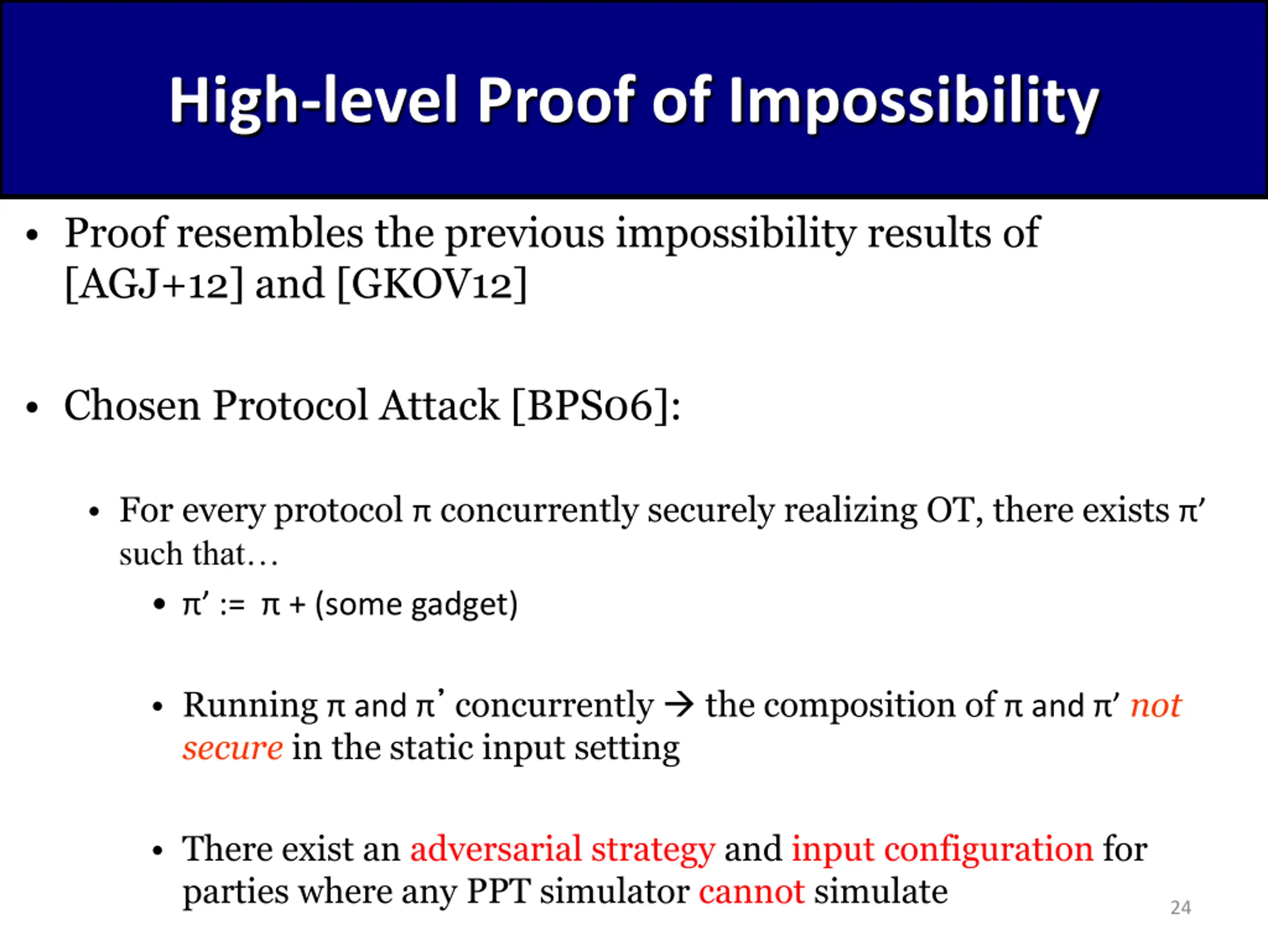 High-level Proof of Impossibility Proof resembles the previous impossibility results of [AGJ+12] and [GKOV12] Chosen Protocol Attack [BPS06]: For every protocol concurrently securely realizing OT, there exists such that := + (some gadget) Running and concurrently the composition of and not secure in the static input setting There exist an adversarial strategy and input configuration for parties where any PPT simulator cannot simulate 24