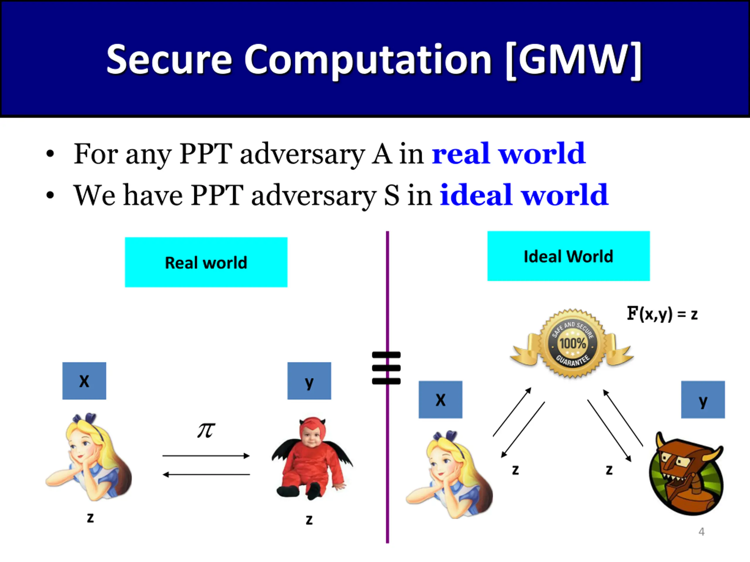 Secure Computation [GMW] Functionality F(x,y) Protocol Ideal World Real world F F(x,y) = z X y X y z z z z 3