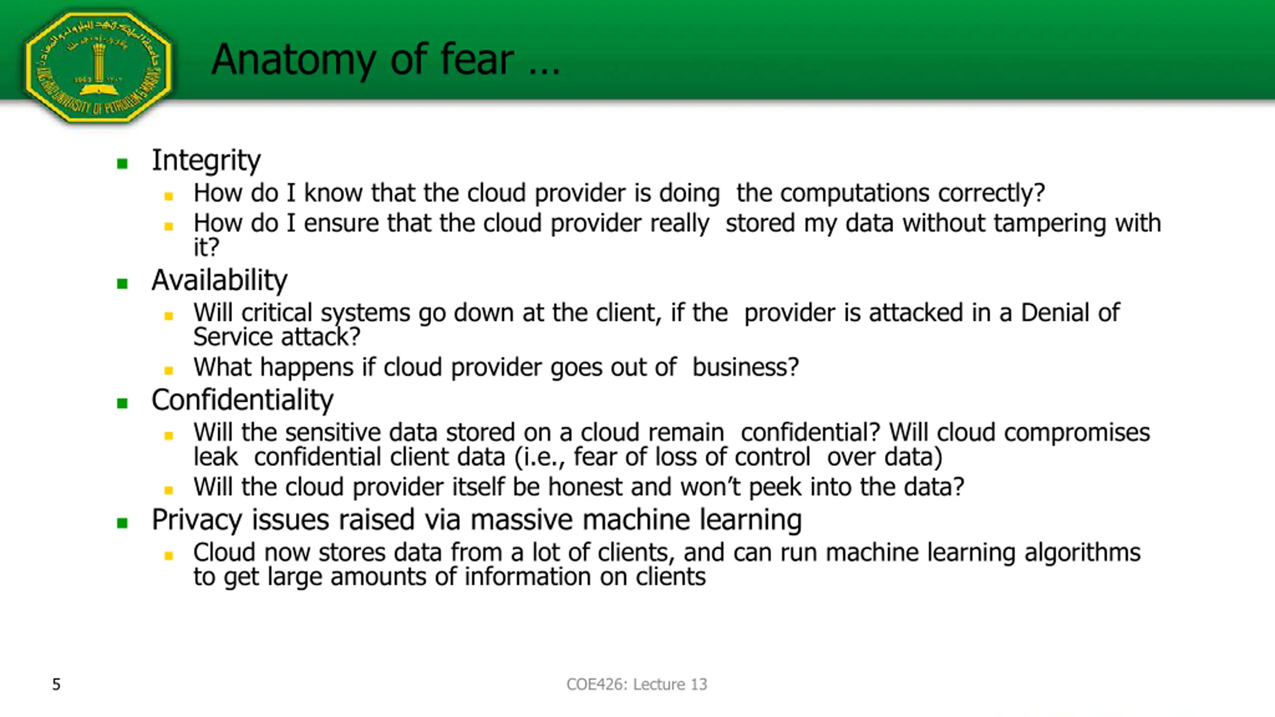 Anatomy of fear Integrity How do I know that the cloud provider is doing the computations correctly? How do I ensure that the cloud provider really stored my data without tampering with it? Availability Will critical systems go down at the client, if the provider is attacked in a Denial of Service attack? What happens if cloud provider goes out of business? Confidentiality Will the sensitive data stored on a cloud remain confidential? Will cloud compromises leak confidential client data (i.e., fear of loss of control over data) Will the cloud provider itself be honest and won t peek into the data? Privacy issues raised via massive machine learning Cloud now stores data from a lot of clients, and can run machine learning algorithms to get large amounts of information on clients 5 COE426: Lecture 13