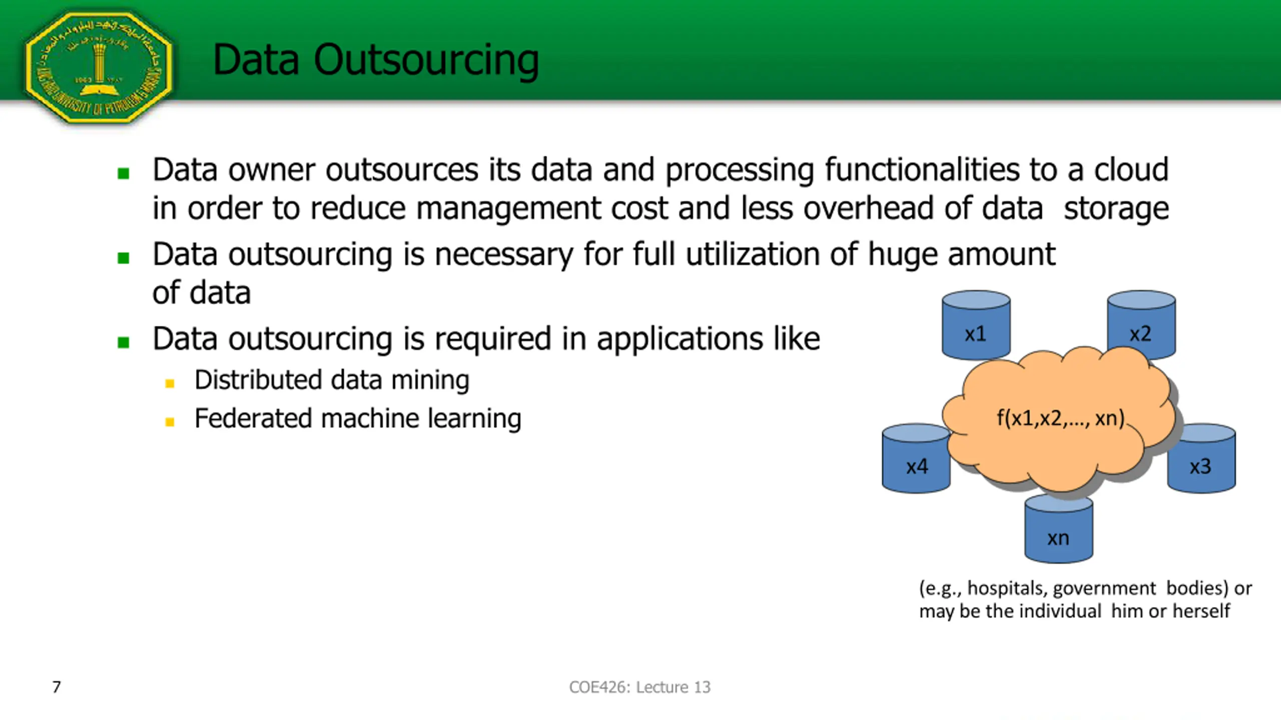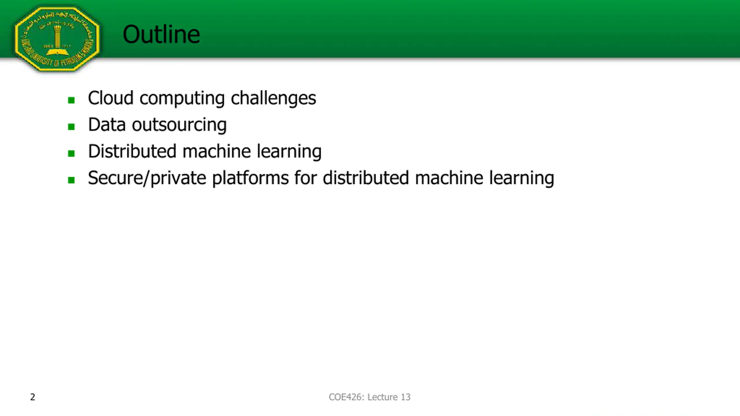 Outline Cloud computing challenges Data outsourcing Distributed machine learning Secure/private platforms for distributed machine learning 2 COE426: Lecture 13