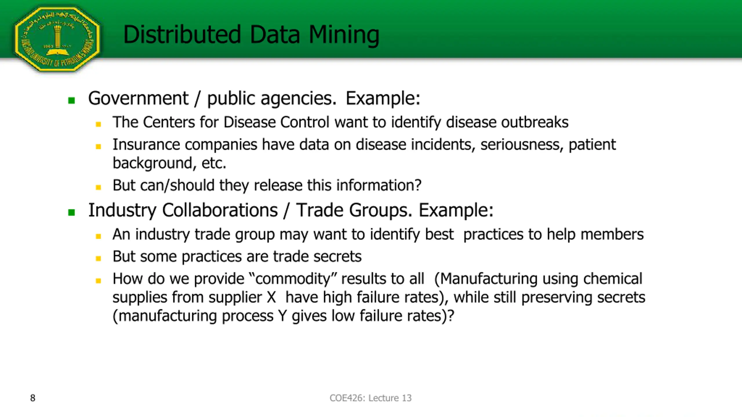 Distributed Data Mining Government / public agencies. Example: The Centers for Disease Control want to identify disease outbreaks Insurance companies have data on disease incidents, seriousness, patient background, etc. But can/should they release this information? Industry Collaborations / Trade Groups. Example: An industry trade group may want to identify best practices to help members But some practices are trade secrets How do we provide commodity results to all (Manufacturing using chemical supplies from supplier X have high failure rates), while still preserving secrets (manufacturing process Y gives low failure rates)? 8 COE426: Lecture 13