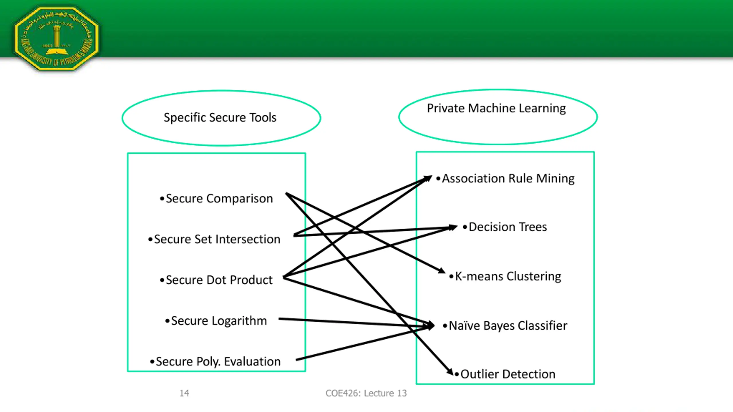 Private Machine Learning Specific Secure Tools Association Rule Mining Secure Comparison Decision Trees Secure Set Intersection K-means Clustering Secure Dot Product Secure Logarithm Na ve Bayes Classifier Secure Poly. Evaluation Outlier Detection 14 COE426: Lecture 13