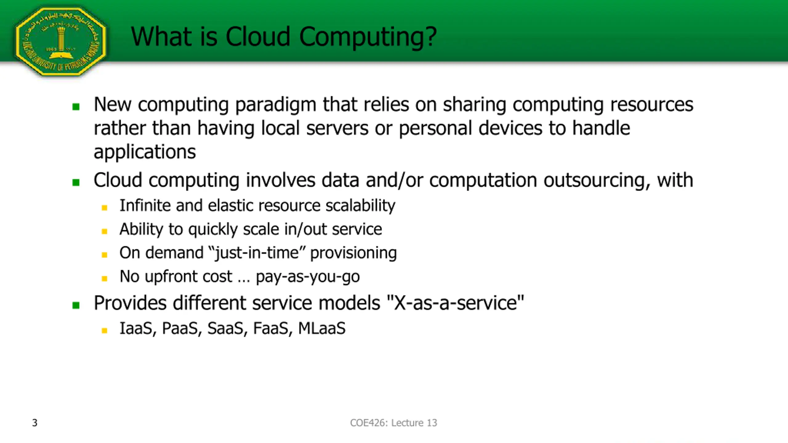 What is Cloud Computing? New computing paradigm that relies on sharing computing resources rather than having local servers or personal devices to handle applications Cloud computing involves data and/or computation outsourcing, with Infinite and elastic resource scalability Ability to quickly scale in/out service On demand just-in-time provisioning No upfront cost pay-as-you-go Provides different service models "X-as-a-service" IaaS, PaaS, SaaS, FaaS, MLaaS 3 COE426: Lecture 13