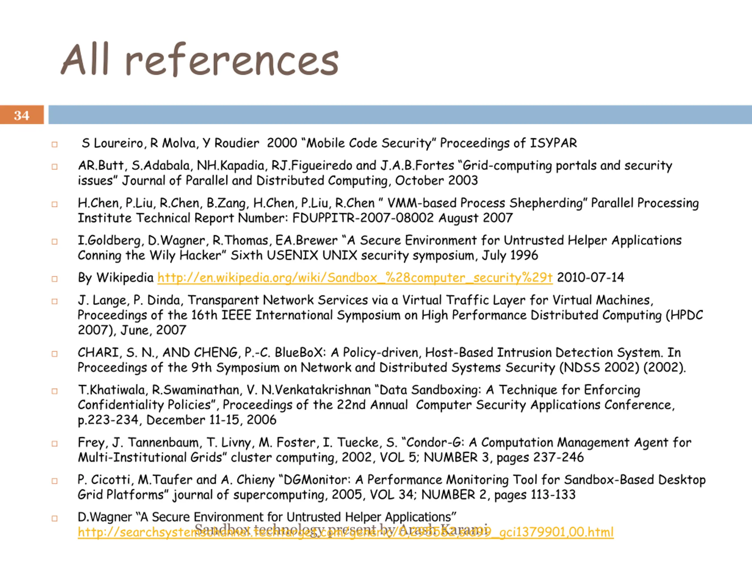 All references 34 S Loureiro, R Molva, Y Roudier 2000 Mobile Code Security Proceedings of ISYPAR AR.Butt, S.Adabala, NH.Kapadia, RJ.Figueiredo and J.A.B.Fortes Grid-computing portals and security issues Journal of Parallel and Distributed Computing, October 2003 H.Chen, P.Liu, R.Chen, B.Zang, H.Chen, P.Liu, R.Chen VMM-based Process Shepherding Parallel Processing Institute Technical Report Number: FDUPPITR-2007-08002 August 2007 I.Goldberg, D.Wagner, R.Thomas, EA.Brewer A Secure Environment for Untrusted Helper Applications Conning the Wily Hacker Sixth USENIX UNIX security symposium, July 1996 By Wikipedia http://en.wikipedia.org/wiki/Sandbox_%28computer_security%29t 2010-07-14 J. Lange, P. Dinda, Transparent Network Services via a Virtual Traffic Layer for Virtual Machines, Proceedings of the 16th IEEE International Symposium on High Performance Distributed Computing (HPDC 2007), June, 2007 CHARI, S. N., AND CHENG, P.-C. BlueBoX: A Policy-driven, Host-Based Intrusion Detection System. In Proceedings of the 9th Symposium on Network and Distributed Systems Security (NDSS 2002) (2002). T.Khatiwala, R.Swaminathan, V. N.Venkatakrishnan Data Sandboxing: A Technique for Enforcing Confidentiality Policies , Proceedings of the 22nd Annual Computer Security Applications Conference, p.223-234, December 11-15, 2006 Frey, J. Tannenbaum, T. Livny, M. Foster, I. Tuecke, S. Condor-G: A Computation Management Agent for Multi-Institutional Grids cluster computing, 2002, VOL 5; NUMBER 3, pages 237-246 P. Cicotti, M.Taufer and A. Chieny DGMonitor: A Performance Monitoring Tool for Sandbox-Based Desktop Grid Platforms journal of supercomputing, 2005, VOL 34; NUMBER 2, pages 113-133 D.Wagner A Secure Environment for Untrusted Helper Applications Sandbox technology present by Arash Karami http://searchsystemschannel.techtarget.com/generic/0,295582,sid99_gci1379901,00.html