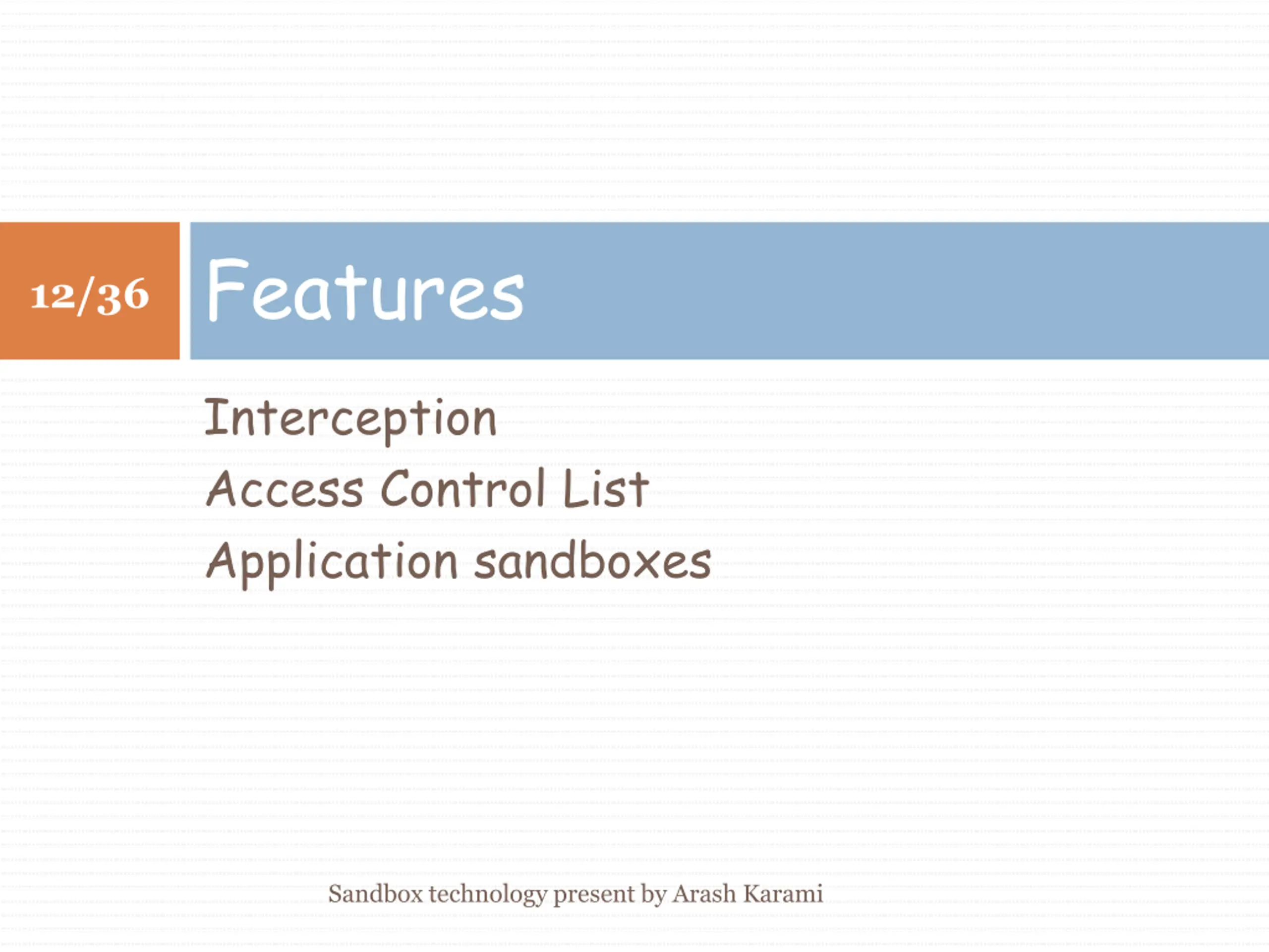 Features 12/36 Interception Access Control List Application sandboxes Sandbox technology present by Arash Karami