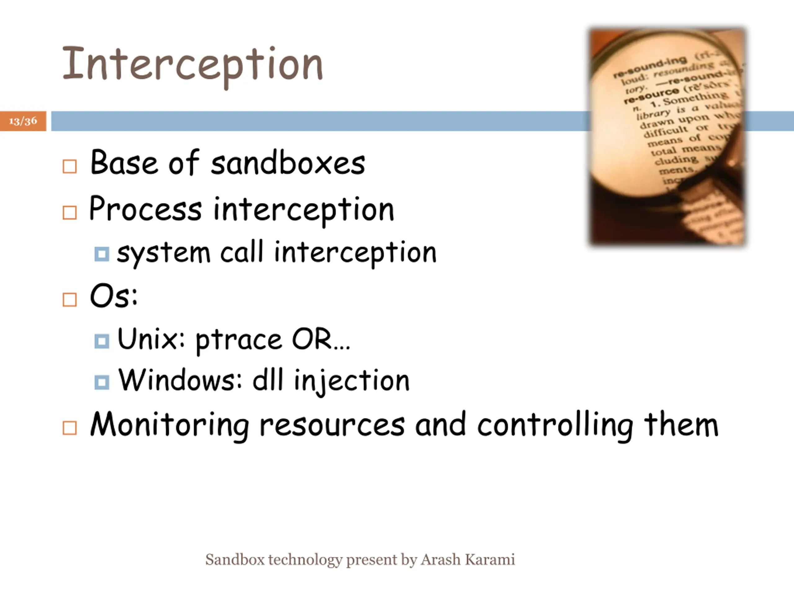 Interception 13/36 Base of sandboxes Process interception system call interception Os: Unix: ptrace OR Windows: dll injection Monitoring resources and controlling them Sandbox technology present by Arash Karami