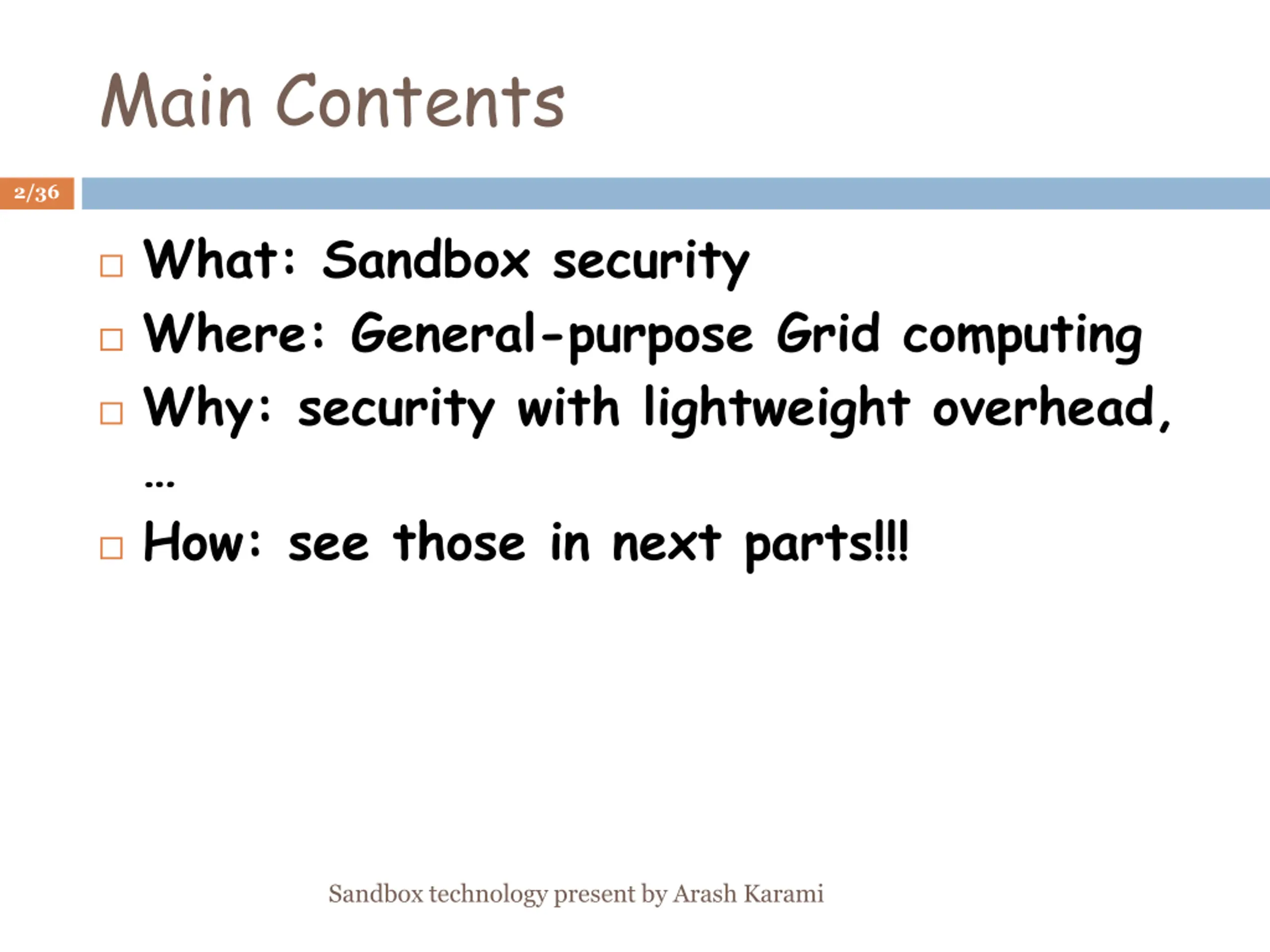 Main Contents 2/36 What: Sandbox security Where: General-purpose Grid computing Why: security with lightweight overhead, How: see those in next parts!!! Sandbox technology present by Arash Karami