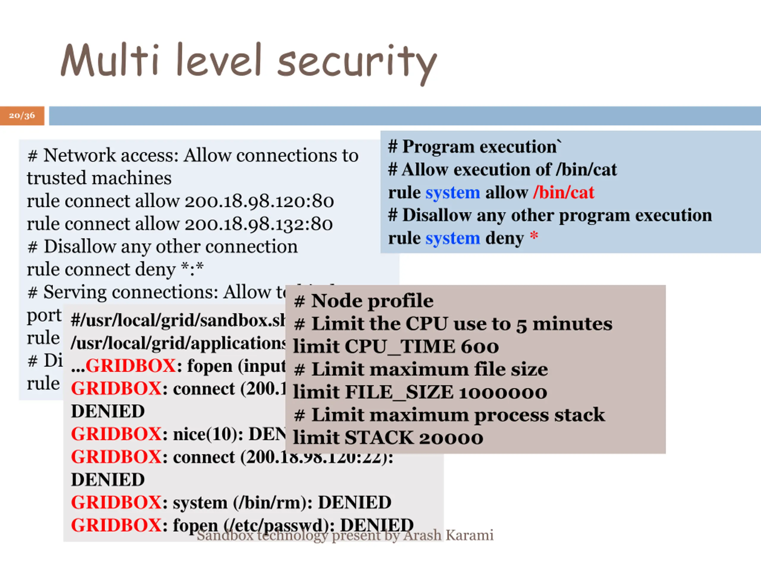 Gridbox 19/36 started at 2005 Lightweight code files & executable file Heterogeneous on Unix base system User mode interception Used in ProGrid, SETI@ Using ACL Multi level security Sandbox technology present by Arash Karami