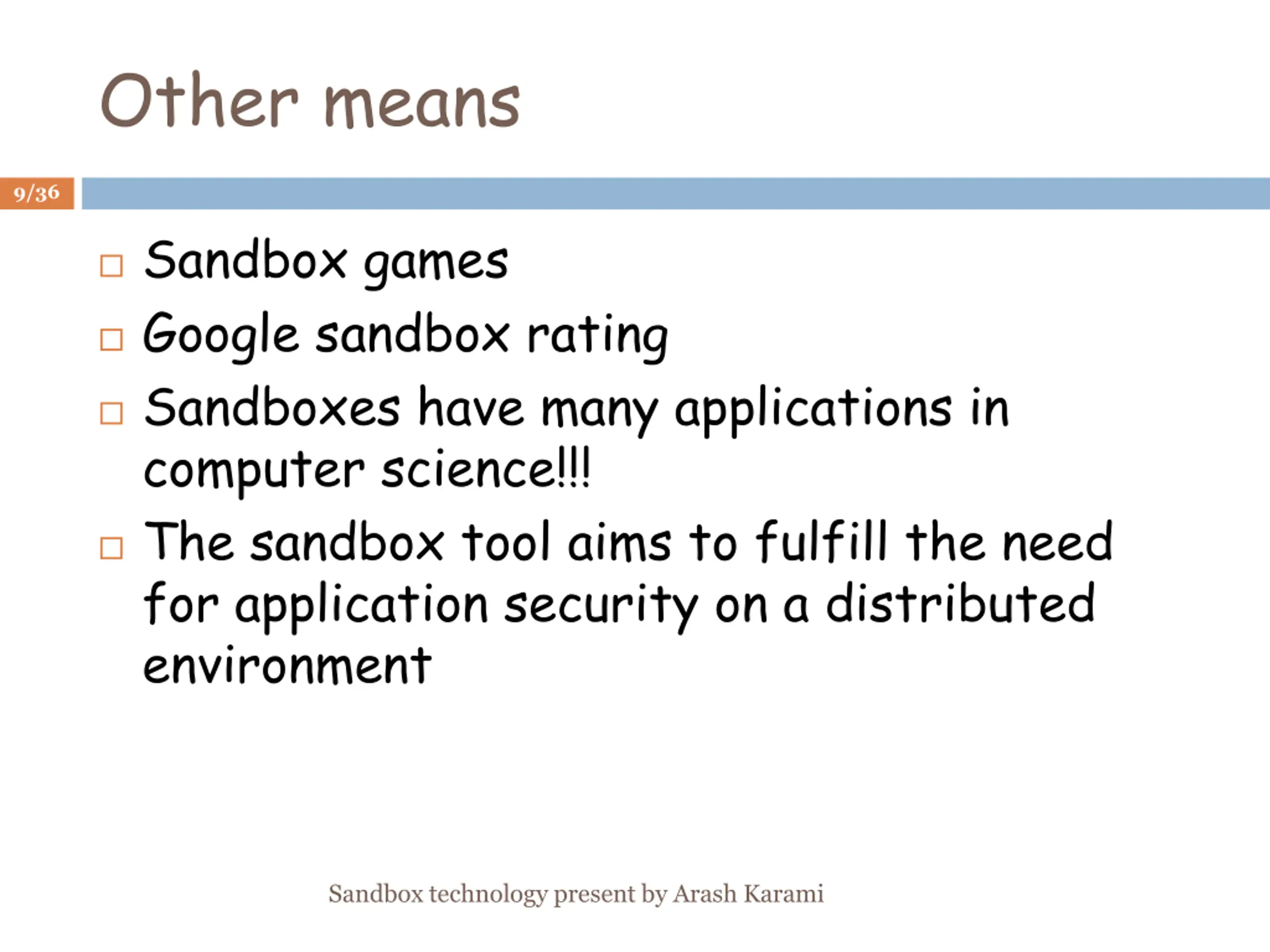Other means 9/36 Sandbox games Google sandbox rating Sandboxes have many applications in computer science!!! The sandbox tool aims to fulfill the need for application security on a distributed environment Sandbox technology present by Arash Karami