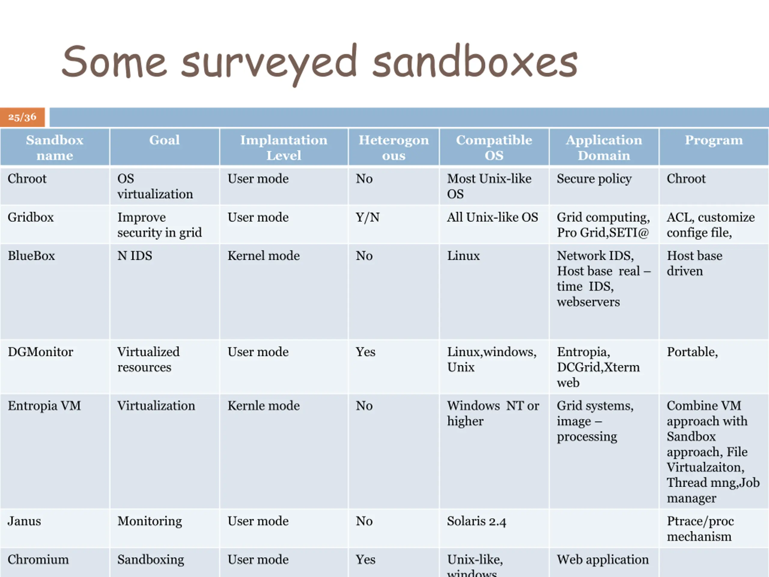 Some surveyed sandboxes 25/36 Sandbox name Goal Implantation Level Heterogon ous Compatible OS Application Domain Program Chroot OS virtualization User mode No Most Unix-like OS Secure policy Chroot Gridbox Improve security in grid User mode Y/N All Unix-like OS Grid computing, Pro Grid,SETI@ ACL, customize confige file, BlueBox N IDS Kernel mode No Linux Network IDS, Host base real time IDS, webservers Host base driven DGMonitor Virtualized resources User mode Yes Linux,windows, Unix Entropia, DCGrid,Xterm web Portable, Entropia VM Virtualization Kernle mode No Windows NT or higher Grid systems, image processing Combine VM approach with Sandbox approach, File Virtualzaiton, Thread mng,Job manager Janus Monitoring User mode No Solaris 2.4 Ptrace/proc mechanism Chromium Sandboxing User mode Yes Unix-like, windows Web application