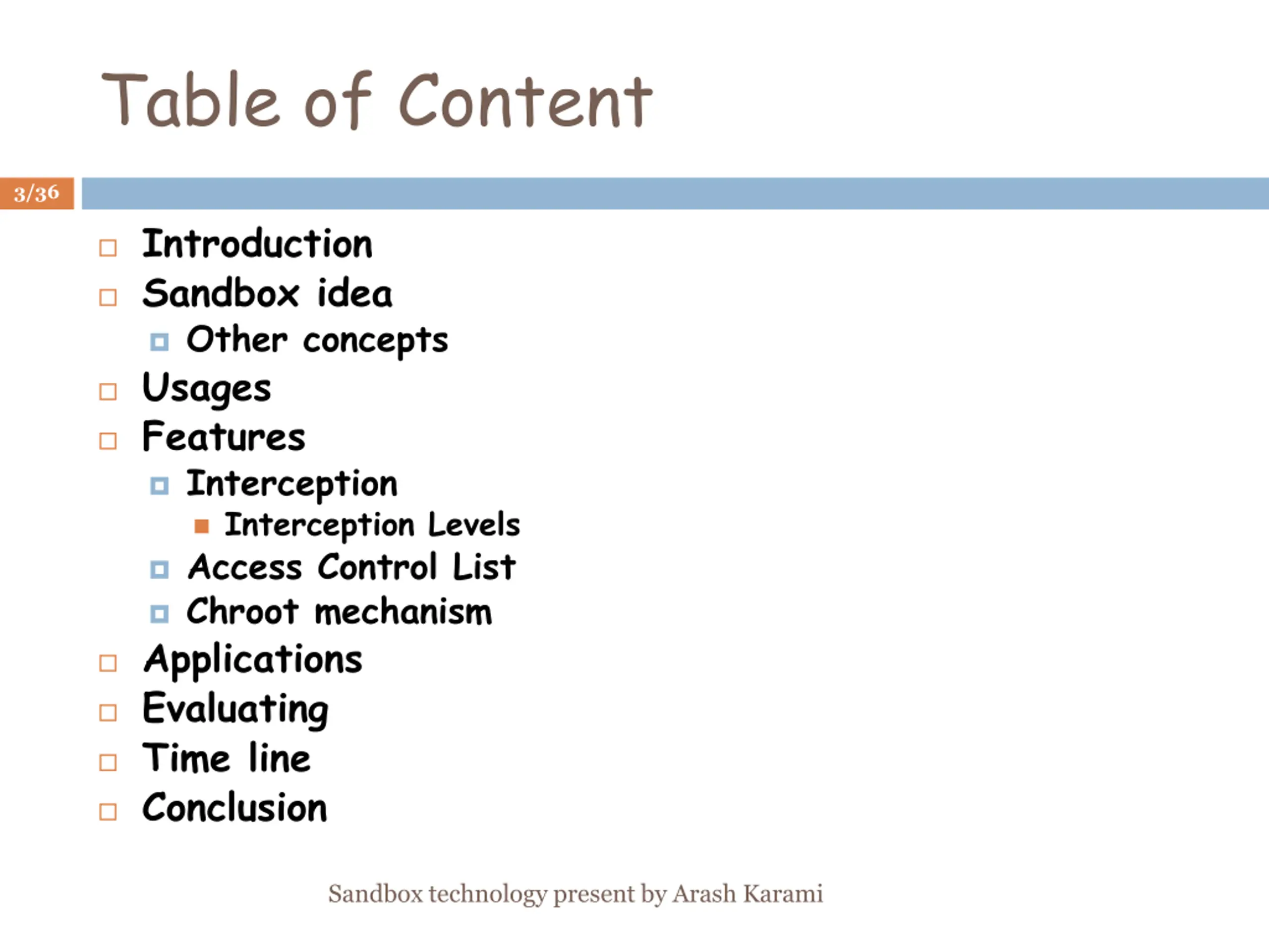 Table of Content 3/36 Introduction Sandbox idea Other concepts Usages Features Interception Interception Levels Access Control List Chroot mechanism Applications Evaluating Time line Conclusion Sandbox technology present by Arash Karami