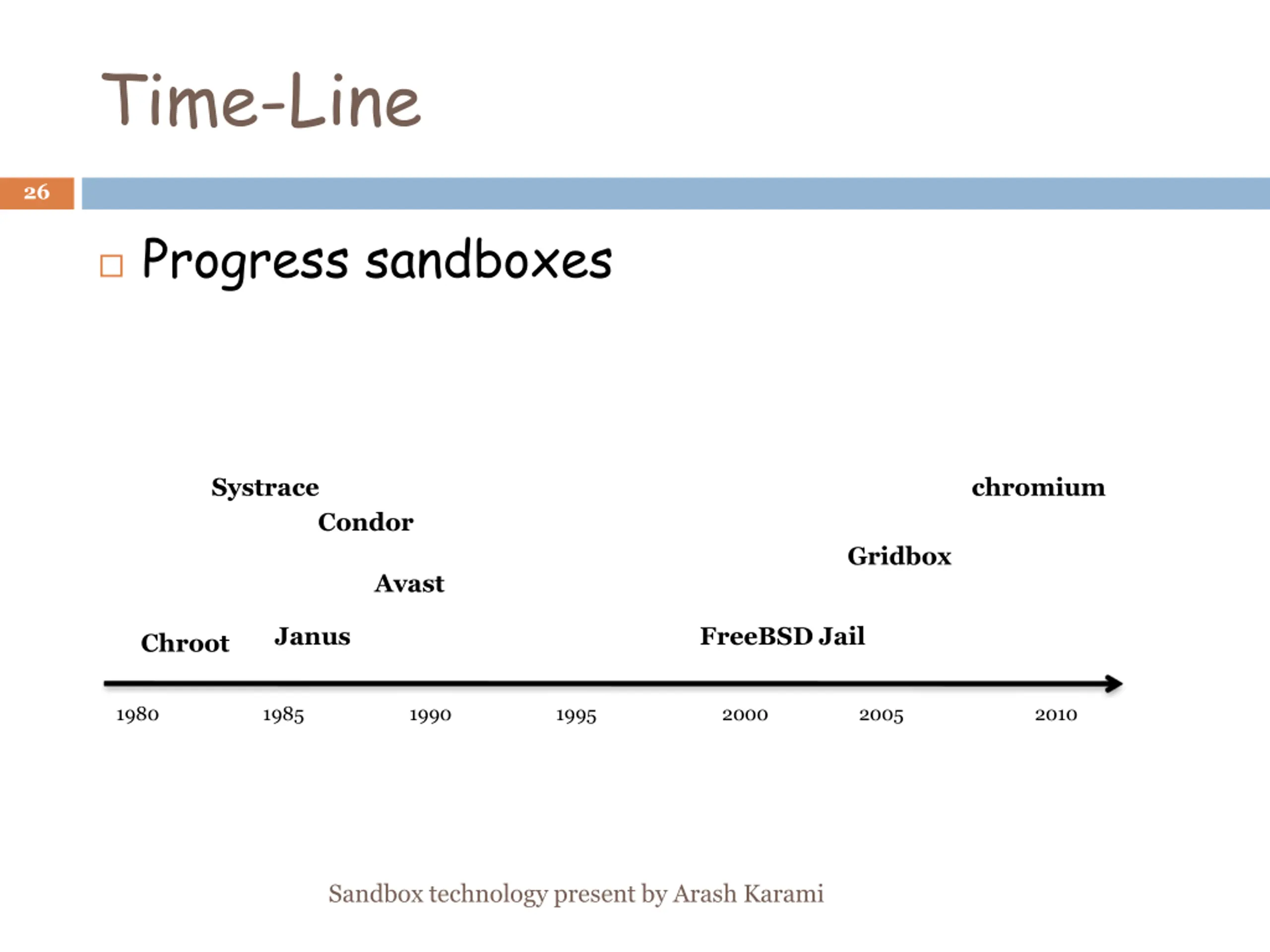 Time-Line 26 Progress sandboxes Systrace chromium Condor Gridbox Avast Janus FreeBSD Jail Chroot 1980 1985 1990 1995 2000 2005 2010 Sandbox technology present by Arash Karami