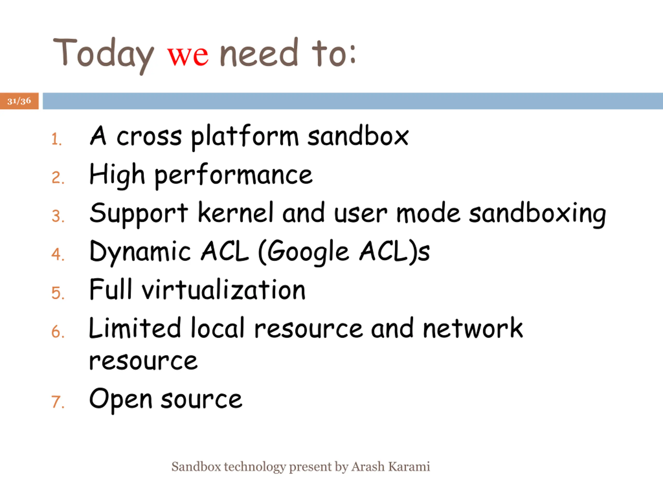 Today we need to: 31/36 A cross platform sandbox 1. 2. High performance 3. Support kernel and user mode sandboxing 4. Dynamic ACL (Google ACL)s 5. Full virtualization 6. Limited local resource and network resource 7. Open source Sandbox technology present by Arash Karami