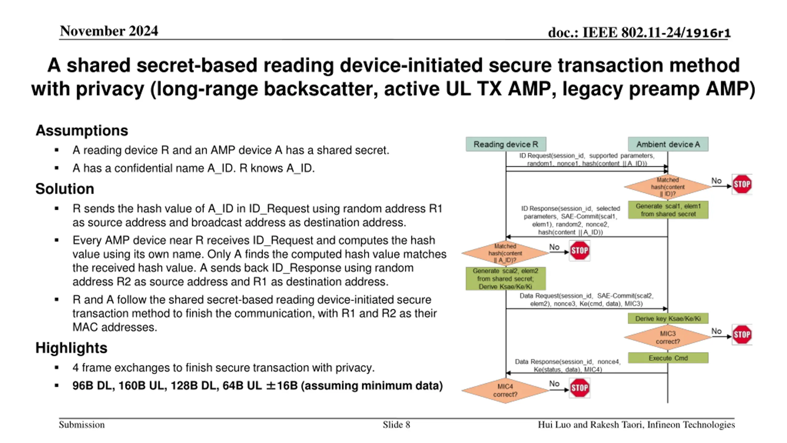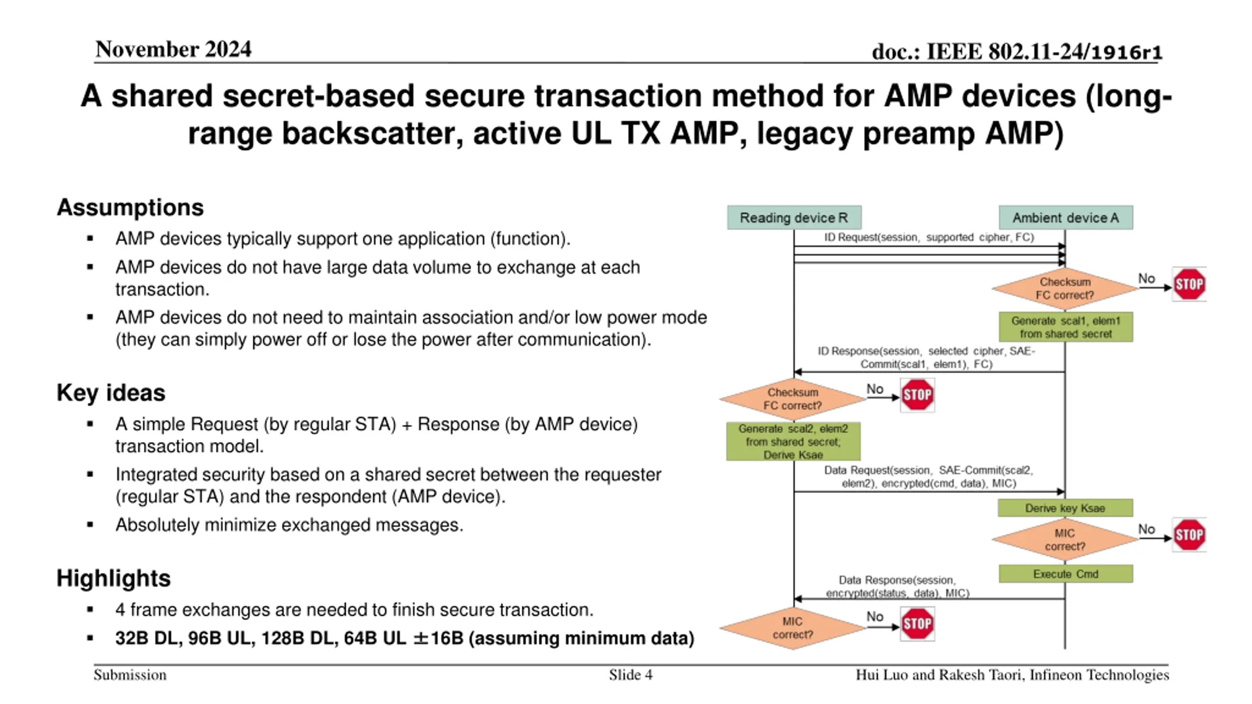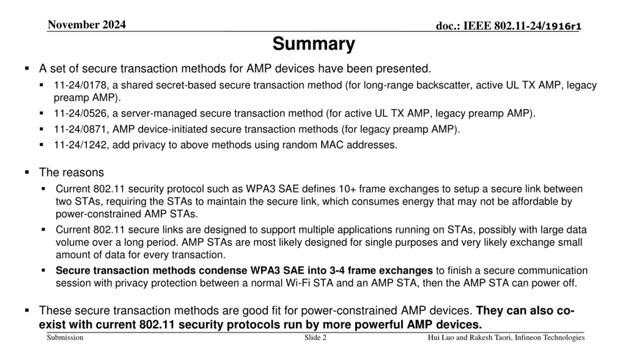 November 2024 doc.: IEEE 802.11-24/1916r1 Summary A set of secure transaction methods for AMP devices have been presented. 11-24/0178, a shared secret-based secure transaction method (for long-range backscatter, active UL TX AMP, legacy preamp AMP). 11-24/0526, a server-managed secure transaction method (for active UL TX AMP, legacy preamp AMP). 11-24/0871, AMP device-initiated secure transaction methods (for legacy preamp AMP). 11-24/1242, add privacy to above methods using random MAC addresses. The reasons Current 802.11 security protocol such as WPA3 SAE defines 10+ frame exchanges to setup a secure link between two STAs, requiring the STAs to maintain the secure link, which consumes energy that may not be affordable by power-constrained AMP STAs. Current 802.11 secure links are designed to support multiple applications running on STAs, possibly with large data volume over a long period. AMP STAs are most likely designed for single purposes and very likely exchange small amount of data for every transaction. Secure transaction methods condense WPA3 SAE into 3-4 frame exchanges to finish a secure communication session with privacy protection between a normal Wi-Fi STA and an AMP STA, then the AMP STA can power off. These secure transaction methods are good fit for power-constrained AMP devices. They can also co- exist with current 802.11 security protocols run by more powerful AMP devices. Submission Slide 2 Hui Luo and Rakesh Taori, Infineon Technologies