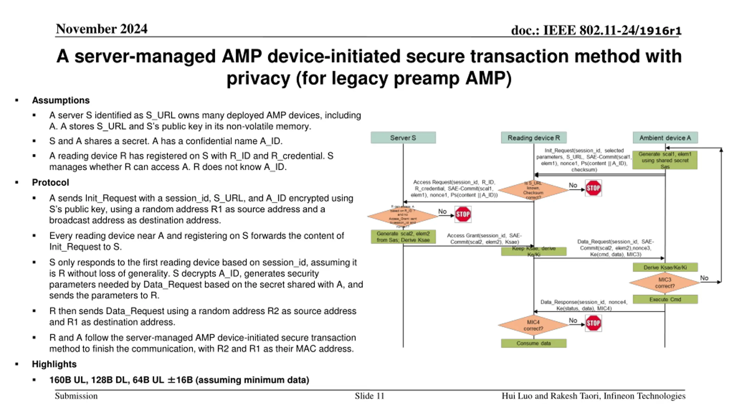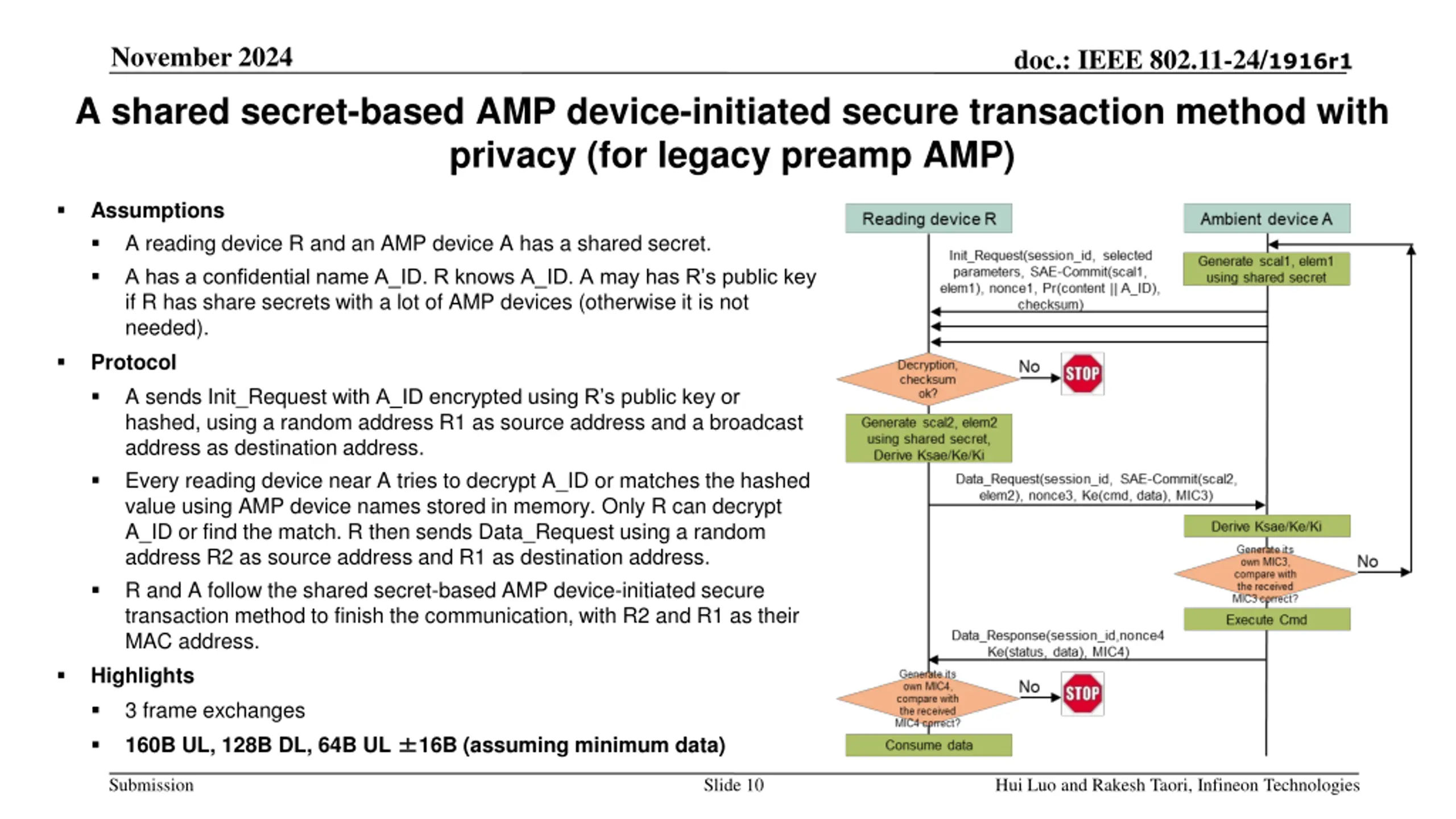 November 2024 doc.: IEEE 802.11-24/1916r1 A shared secret-based AMP device-initiated secure transaction method with privacy (for legacy preamp AMP) Assumptions A reading device R and an AMP device A has a shared secret. A has a confidential name A_ID. R knows A_ID. A may has R s public key if R has share secrets with a lot of AMP devices (otherwise it is not needed). Protocol A sends Init_Request with A_ID encrypted using R s public key or hashed, using a random address R1 as source address and a broadcast address as destination address. Every reading device near A tries to decrypt A_ID or matches the hashed value using AMP device names stored in memory. Only R can decrypt A_ID or find the match. R then sends Data_Request using a random address R2 as source address and R1 as destination address. R and A follow the shared secret-based AMP device-initiated secure transaction method to finish the communication, with R2 and R1 as their MAC address. Highlights 3 frame exchanges 160B UL, 128B DL, 64B UL 16B (assuming minimum data) Submission Slide 10 Hui Luo and Rakesh Taori, Infineon Technologies