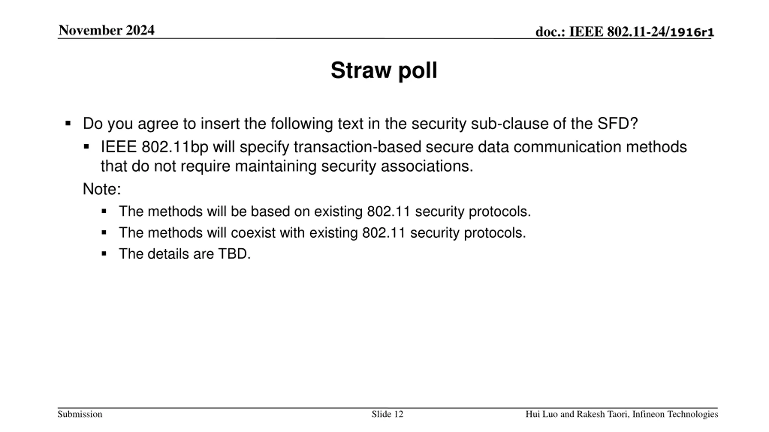 November 2024 doc.: IEEE 802.11-24/1916r1 Straw poll Do you agree to insert the following text in the security sub-clause of the SFD? IEEE 802.11bp will specify transaction-based secure data communication methods that do not require maintaining security associations. Note: The methods will be based on existing 802.11 security protocols. The methods will coexist with existing 802.11 security protocols. The details are TBD. Submission Slide 12 Hui Luo and Rakesh Taori, Infineon Technologies