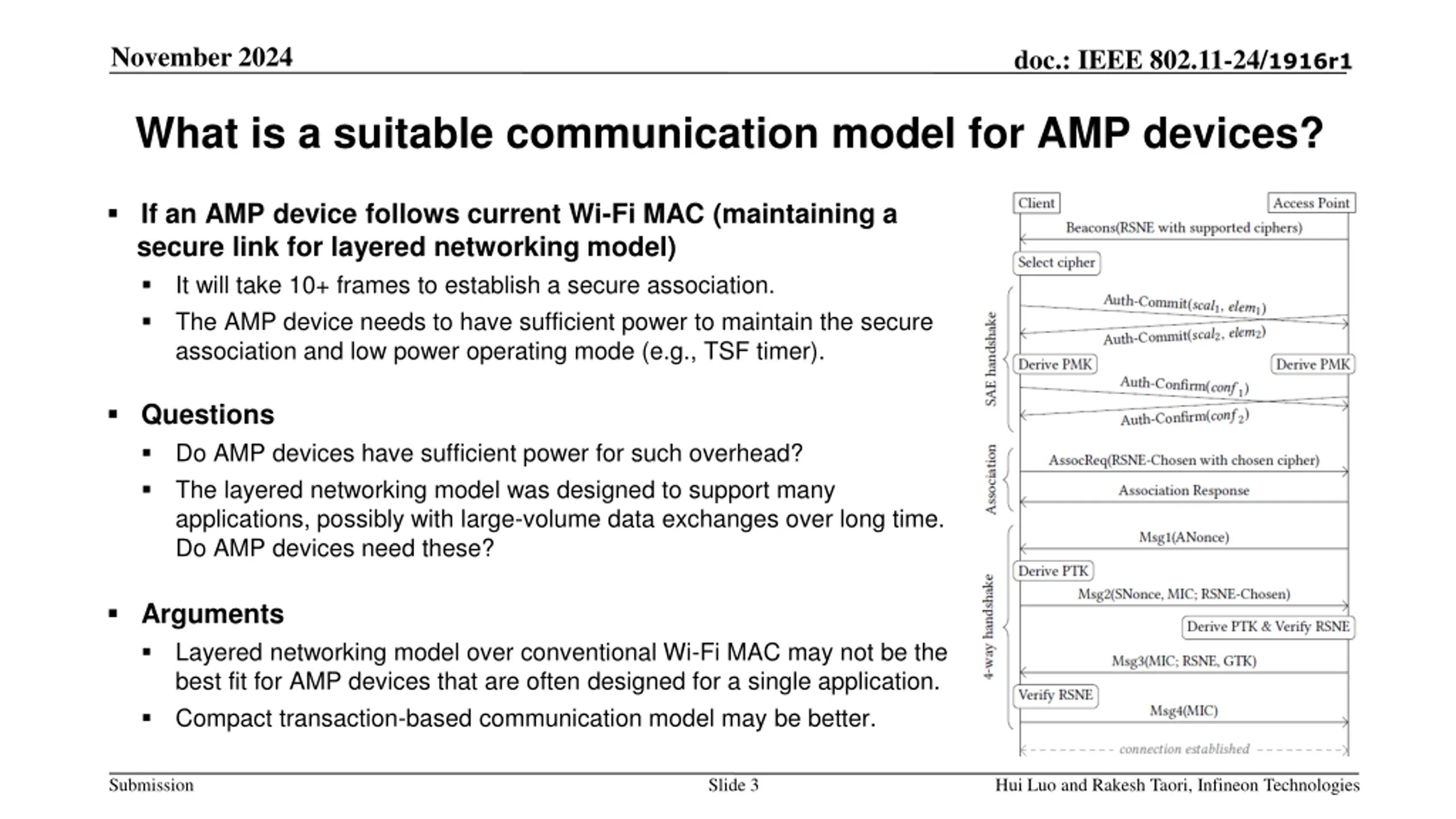 November 2024 doc.: IEEE 802.11-24/1916r1 What is a suitable communication model for AMP devices? If an AMP device follows current Wi-Fi MAC (maintaining a secure link for layered networking model) It will take 10+ frames to establish a secure association. The AMP device needs to have sufficient power to maintain the secure association and low power operating mode (e.g., TSF timer). Questions Do AMP devices have sufficient power for such overhead? The layered networking model was designed to support many applications, possibly with large-volume data exchanges over long time. Do AMP devices need these? Arguments Layered networking model over conventional Wi-Fi MAC may not be the best fit for AMP devices that are often designed for a single application. Compact transaction-based communication model may be better. Submission Slide 3 Hui Luo and Rakesh Taori, Infineon Technologies