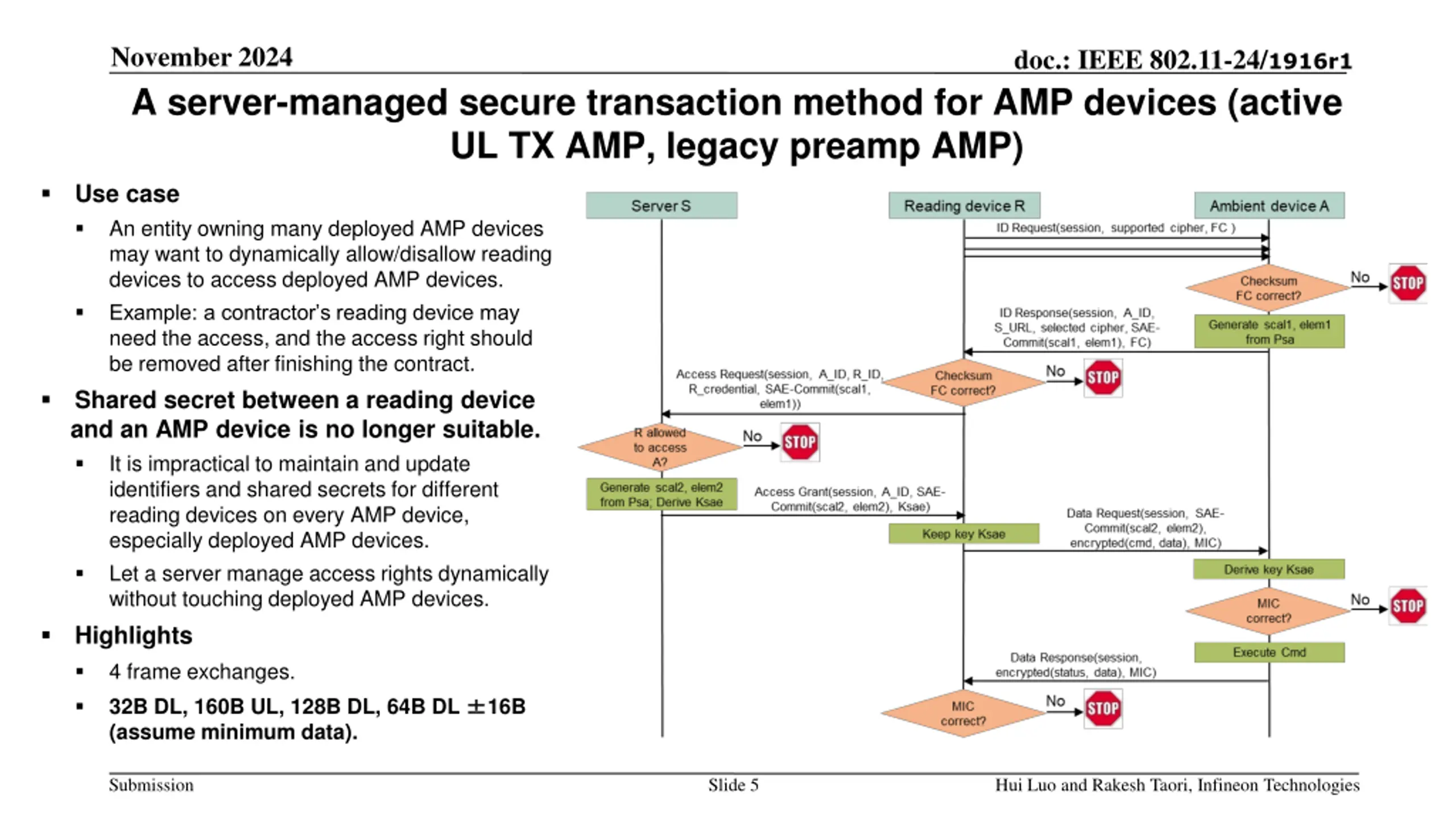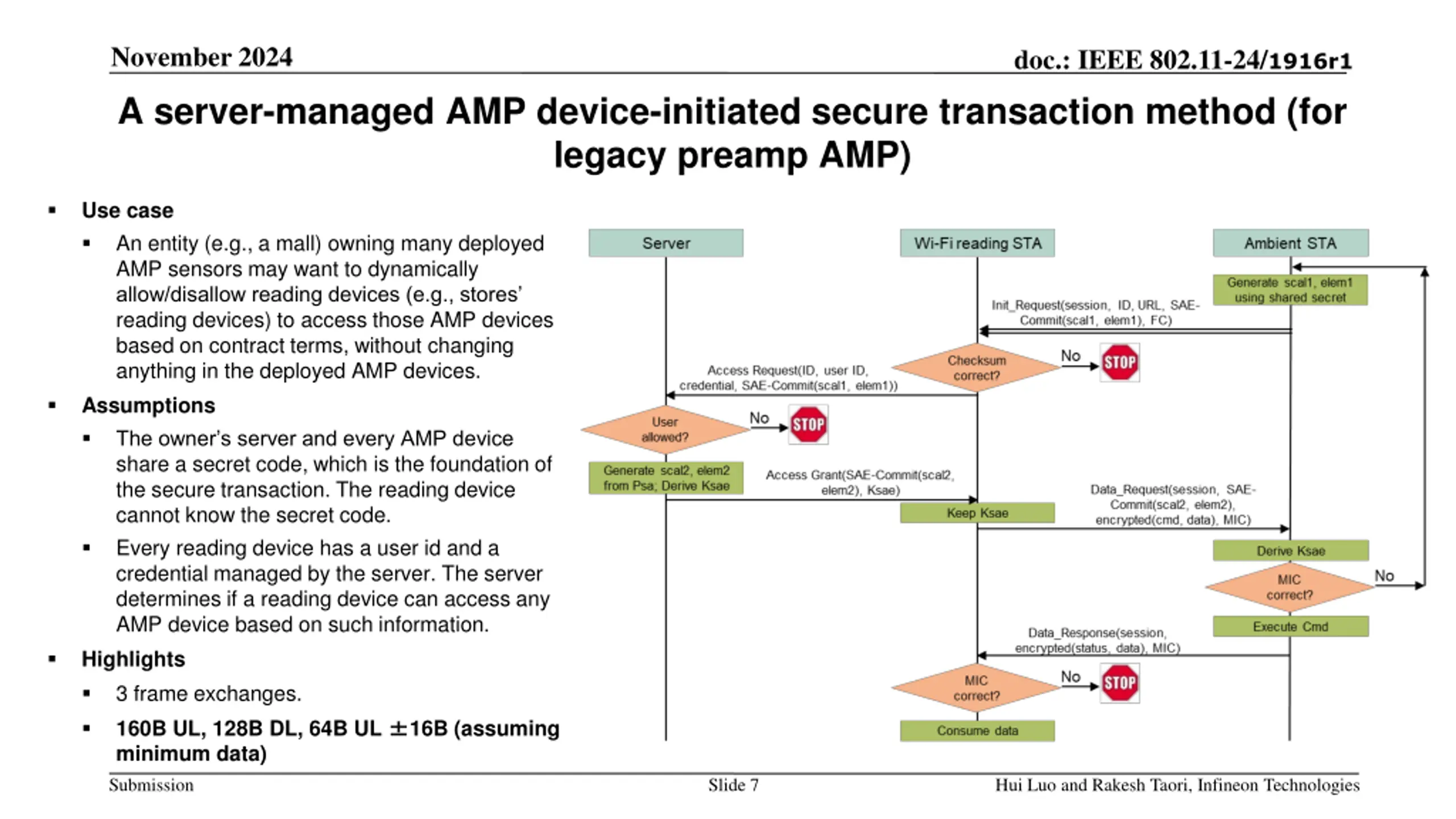 November 2024 doc.: IEEE 802.11-24/1916r1 A server-managed AMP device-initiated secure transaction method (for legacy preamp AMP) Use case An entity (e.g., a mall) owning many deployed AMP sensors may want to dynamically allow/disallow reading devices (e.g., stores reading devices) to access those AMP devices based on contract terms, without changing anything in the deployed AMP devices. Assumptions The owner s server and every AMP device share a secret code, which is the foundation of the secure transaction. The reading device cannot know the secret code. Every reading device has a user id and a credential managed by the server. The server determines if a reading device can access any AMP device based on such information. Highlights 3 frame exchanges. 160B UL, 128B DL, 64B UL minimum data) 16B (assuming Submission Slide 7 Hui Luo and Rakesh Taori, Infineon Technologies