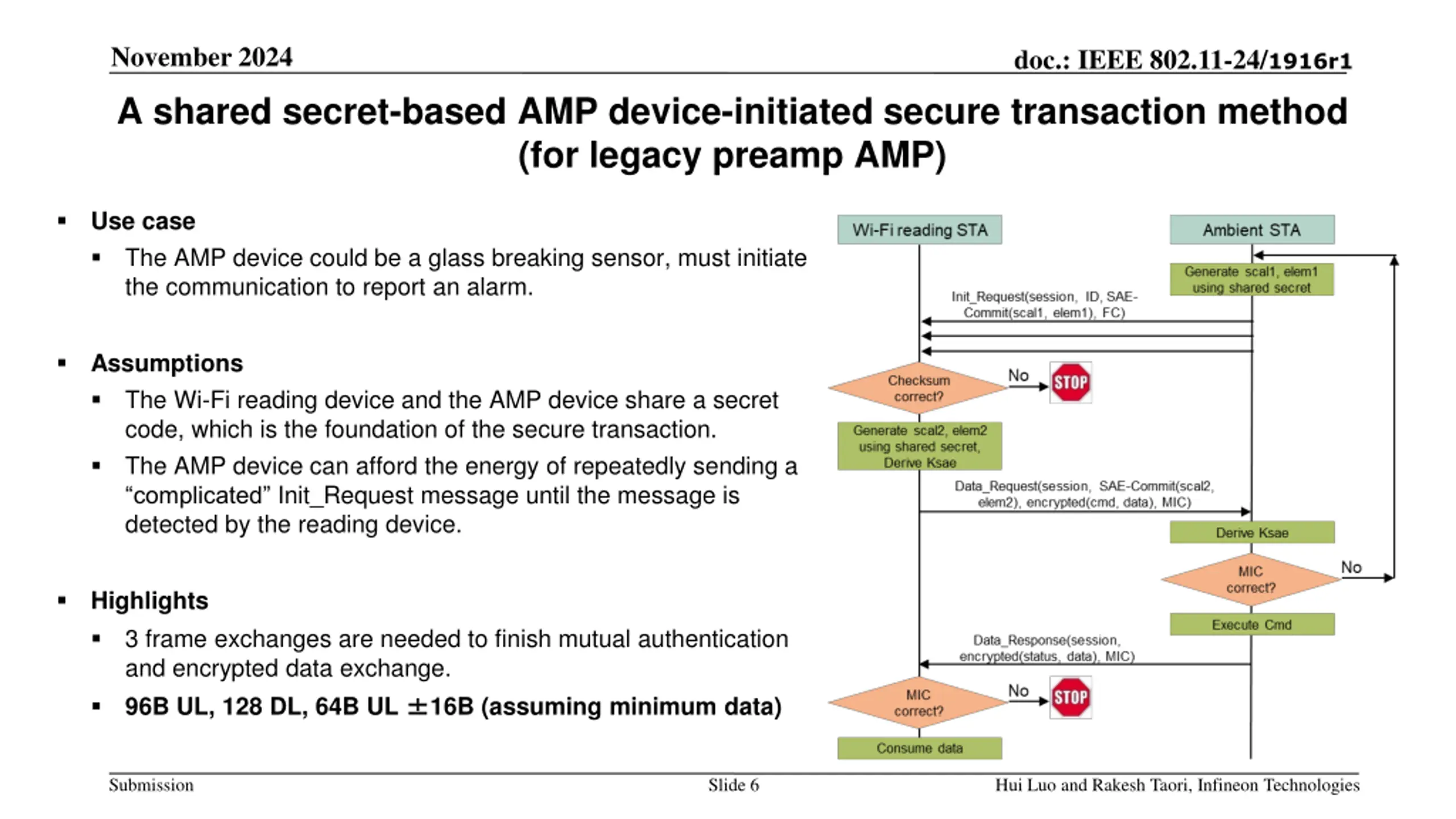 November 2024 doc.: IEEE 802.11-24/1916r1 A shared secret-based AMP device-initiated secure transaction method (for legacy preamp AMP) Use case The AMP device could be a glass breaking sensor, must initiate the communication to report an alarm. Assumptions The Wi-Fi reading device and the AMP device share a secret code, which is the foundation of the secure transaction. The AMP device can afford the energy of repeatedly sending a complicated Init_Request message until the message is detected by the reading device. Highlights 3 frame exchanges are needed to finish mutual authentication and encrypted data exchange. 96B UL, 128 DL, 64B UL 16B (assuming minimum data) Submission Slide 6 Hui Luo and Rakesh Taori, Infineon Technologies