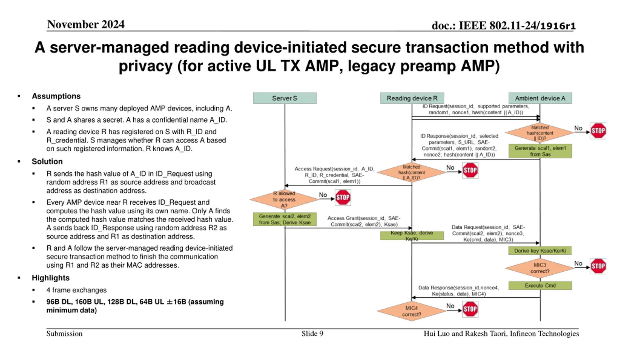 November 2024 doc.: IEEE 802.11-24/1916r1 A server-managed reading device-initiated secure transaction method with privacy (for active UL TX AMP, legacy preamp AMP) Assumptions A server S owns many deployed AMP devices, including A. S and A shares a secret. A has a confidential name A_ID. A reading device R has registered on S with R_ID and R_credential. S manages whether R can access A based on such registered information. R knows A_ID. Solution R sends the hash value of A_ID in ID_Request using random address R1 as source address and broadcast address as destination address. Every AMP device near R receives ID_Request and computes the hash value using its own name. Only A finds the computed hash value matches the received hash value. A sends back ID_Response using random address R2 as source address and R1 as destination address. R and A follow the server-managed reading device-initiated secure transaction method to finish the communication using R1 and R2 as their MAC addresses. Highlights 4 frame exchanges 96B DL, 160B UL, 128B DL, 64B UL minimum data) 16B (assuming Submission Slide 9 Hui Luo and Rakesh Taori, Infineon Technologies
