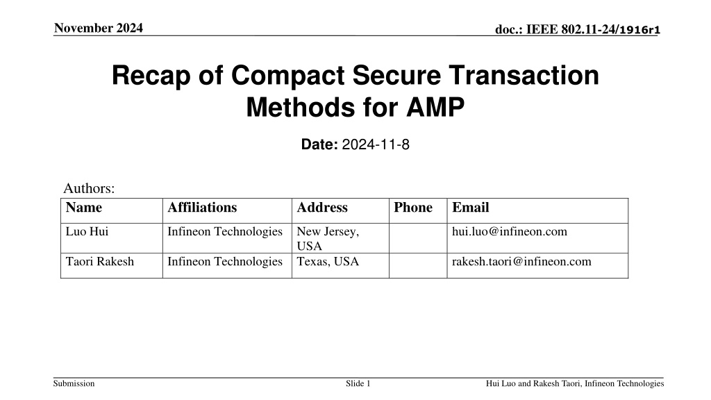 November 2024 doc.: IEEE 802.11-24/1916r1 Recap of Compact Secure Transaction Methods for AMP Date: 2024-11-8 Authors: Name Affiliations Address Phone Email Luo Hui Infineon Technologies New Jersey, hui.luo@infineon.com USA Taori Rakesh Infineon Technologies Texas, USA rakesh.taori@infineon.com Submission Slide 1 Hui Luo and Rakesh Taori, Infineon Technologies