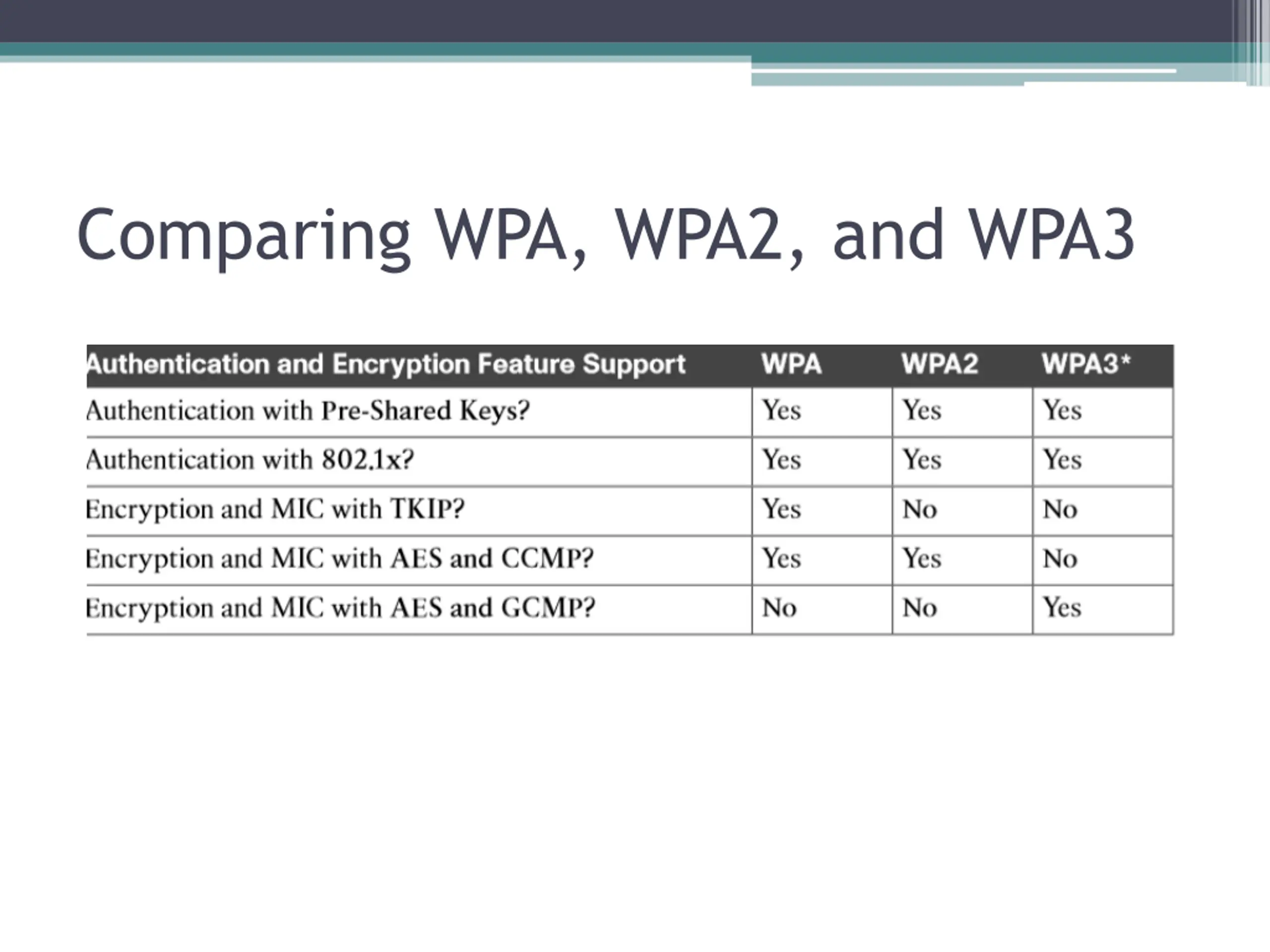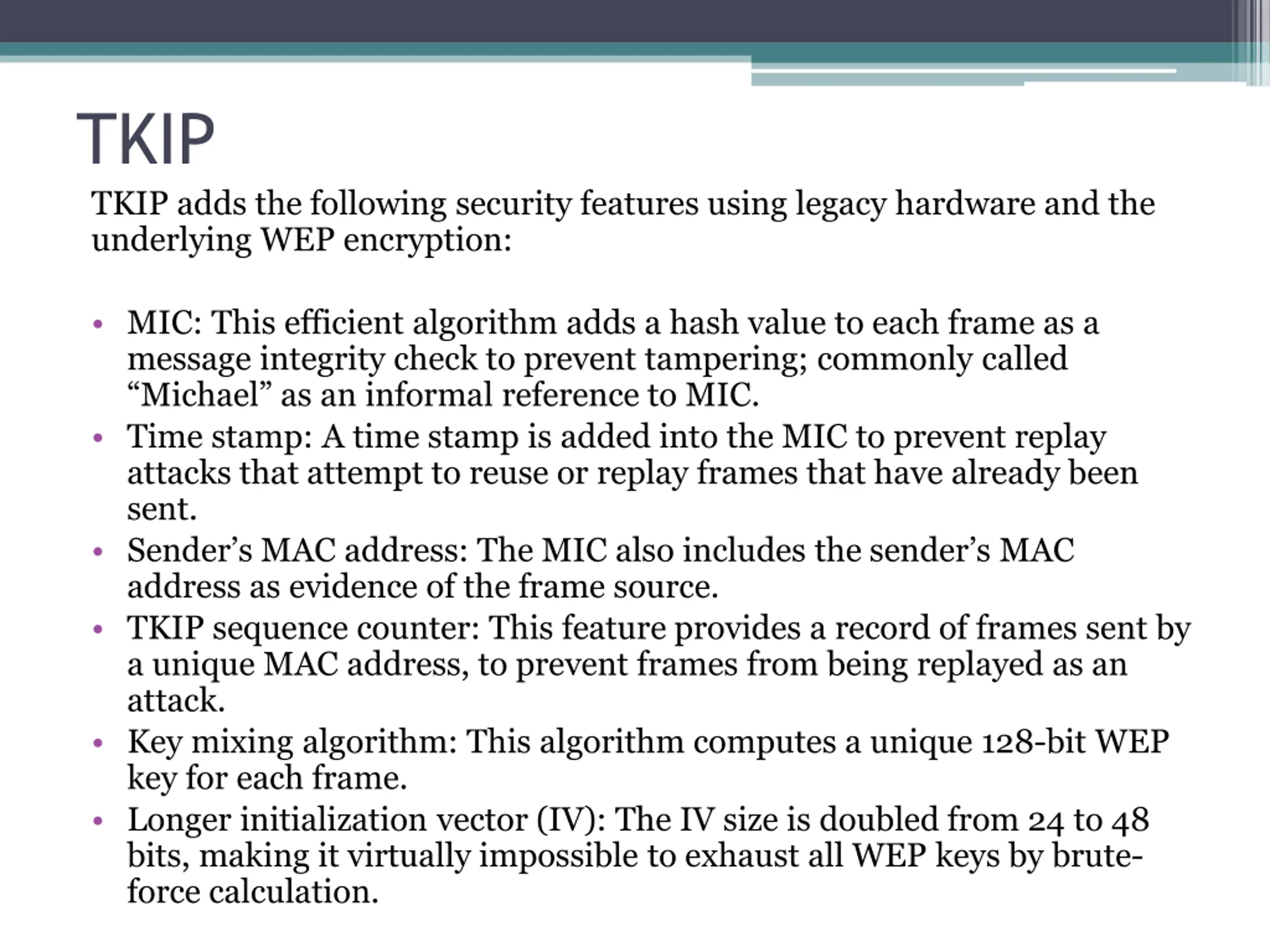 TKIP TKIP adds the following security features using legacy hardware and the underlying WEP encryption: MIC: This efficient algorithm adds a hash value to each frame as a message integrity check to prevent tampering; commonly called Michael as an informal reference to MIC. Time stamp: A time stamp is added into the MIC to prevent replay attacks that attempt to reuse or replay frames that have already been sent. Sender s MAC address: The MIC also includes the sender s MAC address as evidence of the frame source. TKIP sequence counter: This feature provides a record of frames sent by a unique MAC address, to prevent frames from being replayed as an attack. Key mixing algorithm: This algorithm computes a unique 128-bit WEP key for each frame. Longer initialization vector (IV): The IV size is doubled from 24 to 48 bits, making it virtually impossible to exhaust all WEP keys by brute- force calculation.