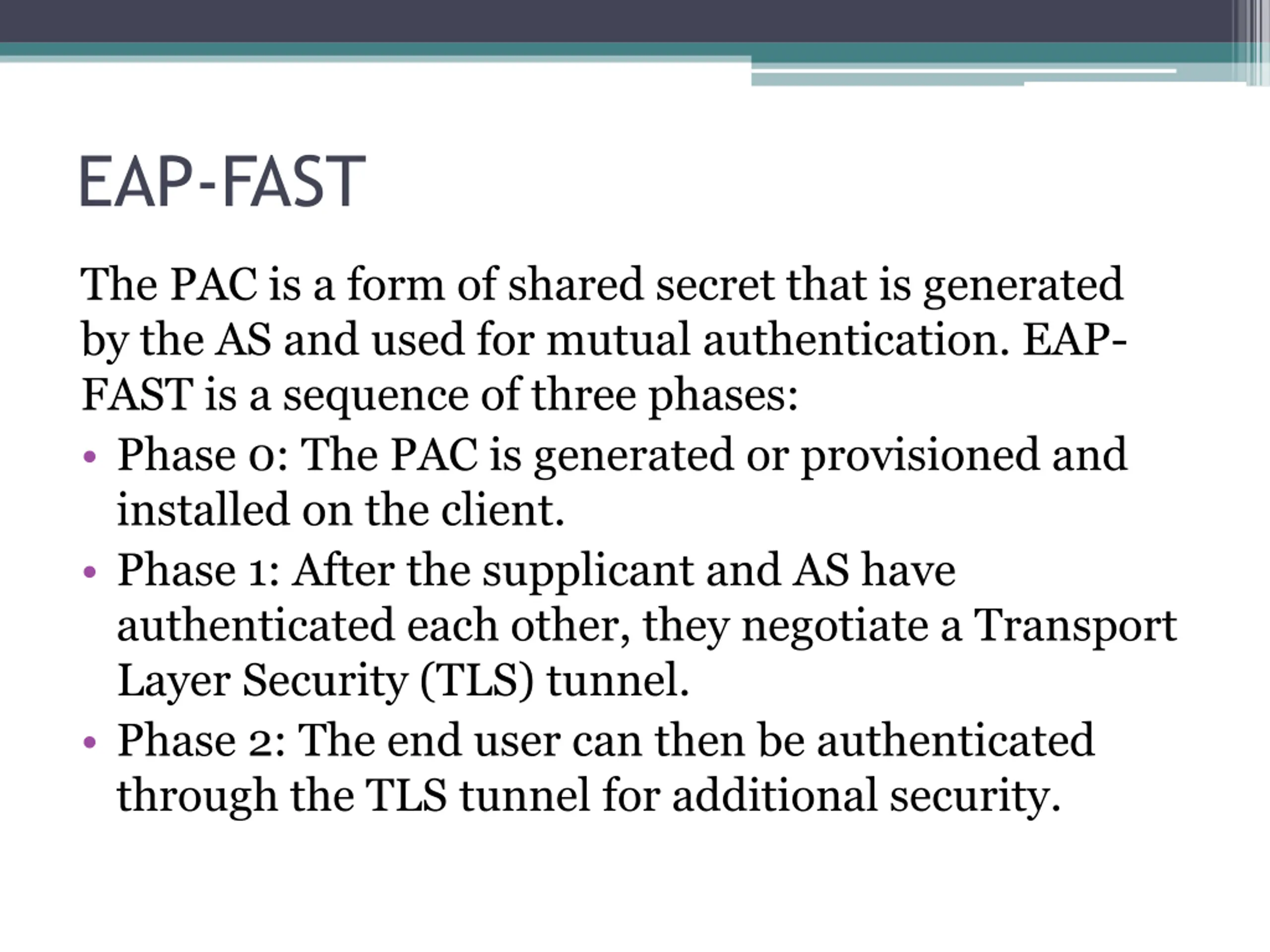 EAP-FAST The PAC is a form of shared secret that is generated by the AS and used for mutual authentication. EAP- FAST is a sequence of three phases: Phase 0: The PAC is generated or provisioned and installed on the client. Phase 1: After the supplicant and AS have authenticated each other, they negotiate a Transport Layer Security (TLS) tunnel. Phase 2: The end user can then be authenticated through the TLS tunnel for additional security.