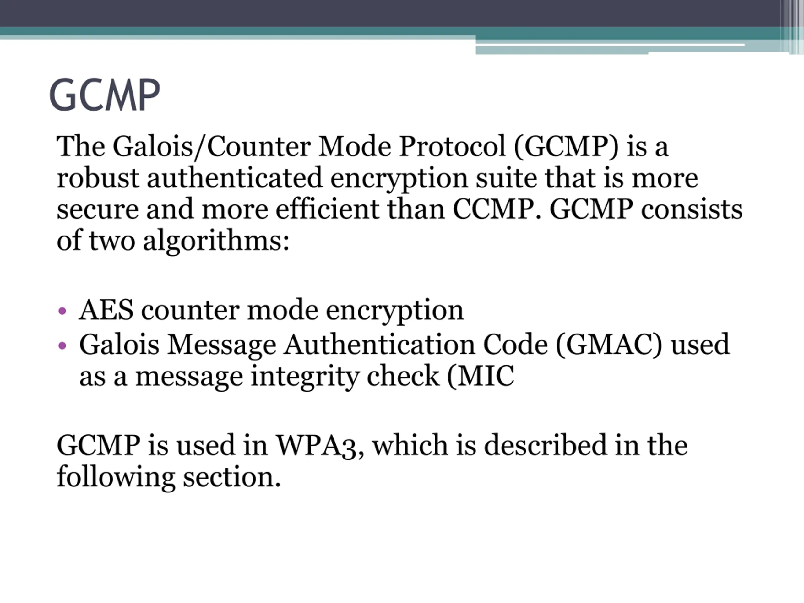 GCMP The Galois/Counter Mode Protocol (GCMP) is a robust authenticated encryption suite that is more secure and more efficient than CCMP. GCMP consists of two algorithms: AES counter mode encryption Galois Message Authentication Code (GMAC) used as a message integrity check (MIC GCMP is used in WPA3, which is described in the following section.