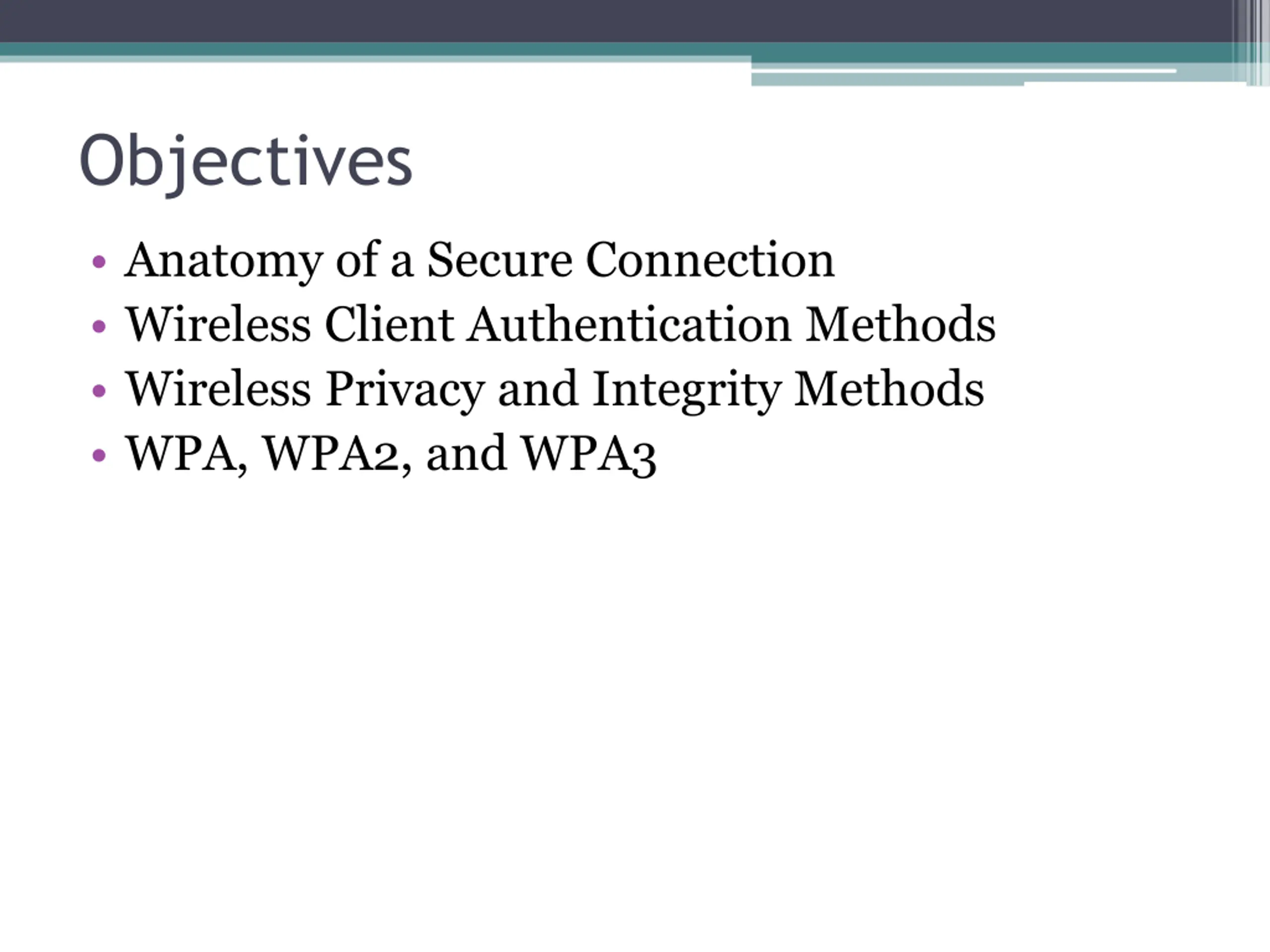 Objectives Anatomy of a Secure Connection Wireless Client Authentication Methods Wireless Privacy and Integrity Methods WPA, WPA2, and WPA3